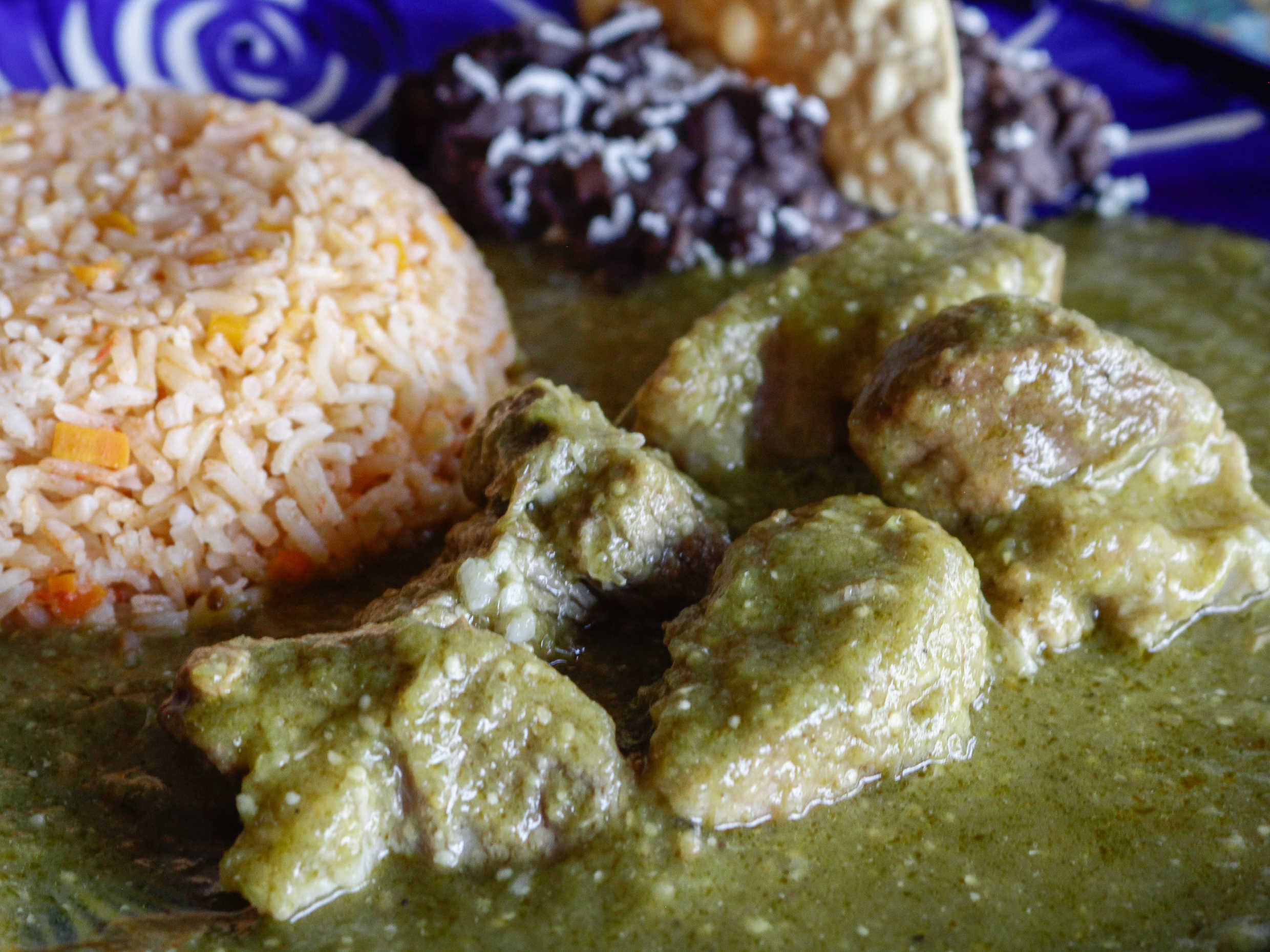 En salsa verde picosita, se acompañan con arroz y frijoles refritos.