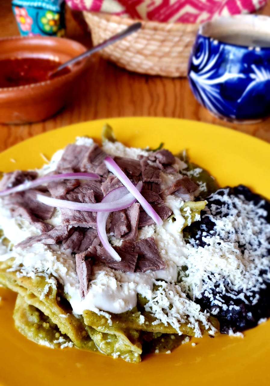 Cecina acompañada con 2 enchiladas, frijoles y guacamole.