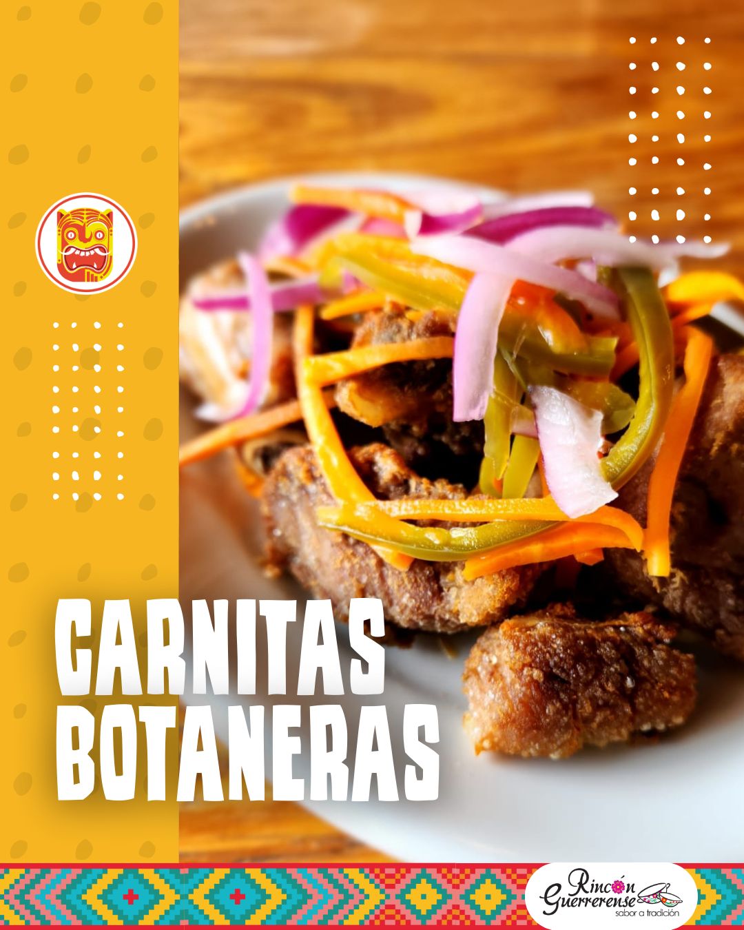 Carnitas de costilla de cerdo estilo guerrero, con ensalada de zanahoria, cebolla morada y jalapeño curtidos.