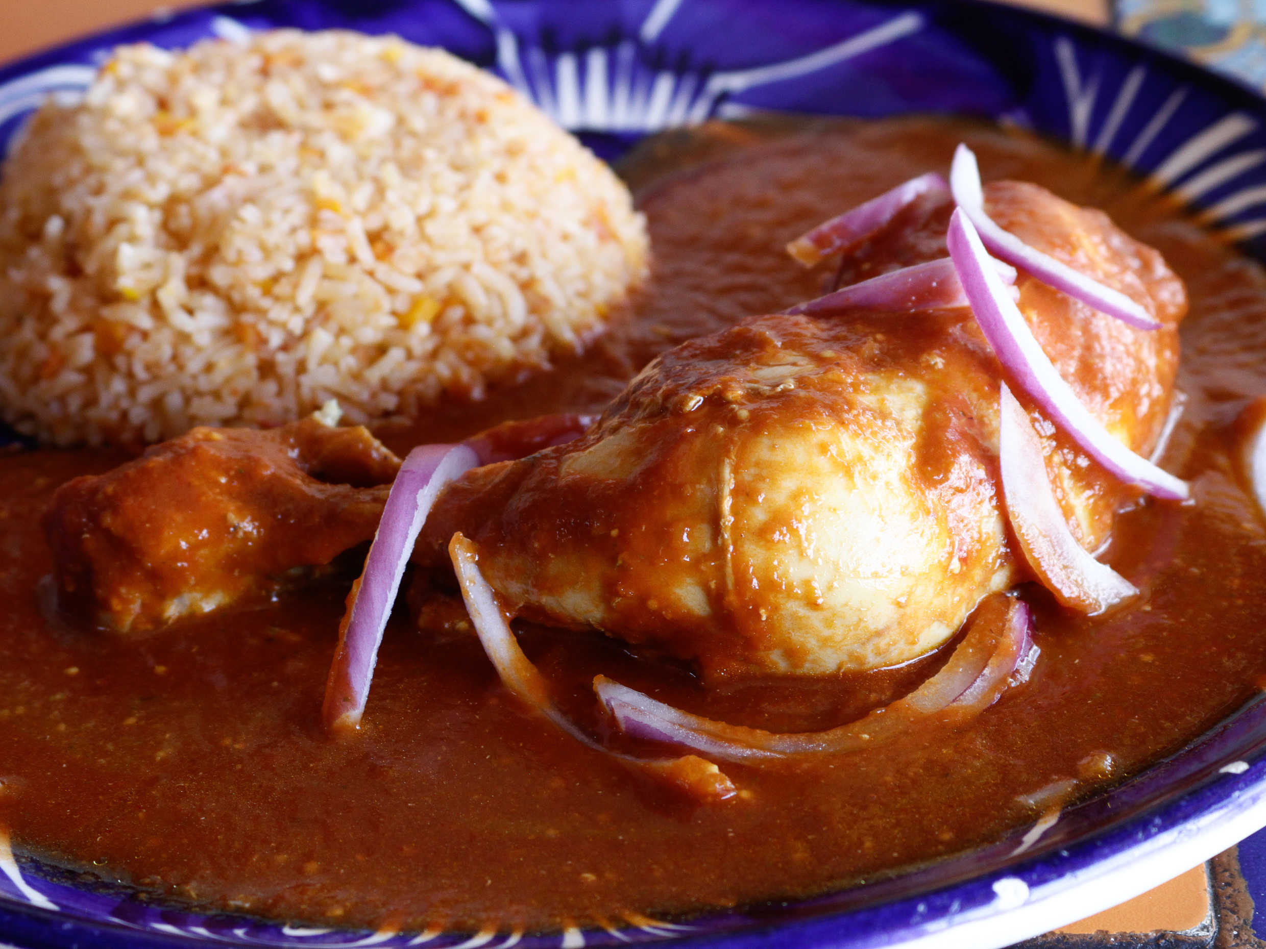 Mole estilo guerrero, una mezcla muy rica que no es muy picosa ni muy dulce. Se sirve con una pieza de pierna con un muslo y se acompaña con arroz.
