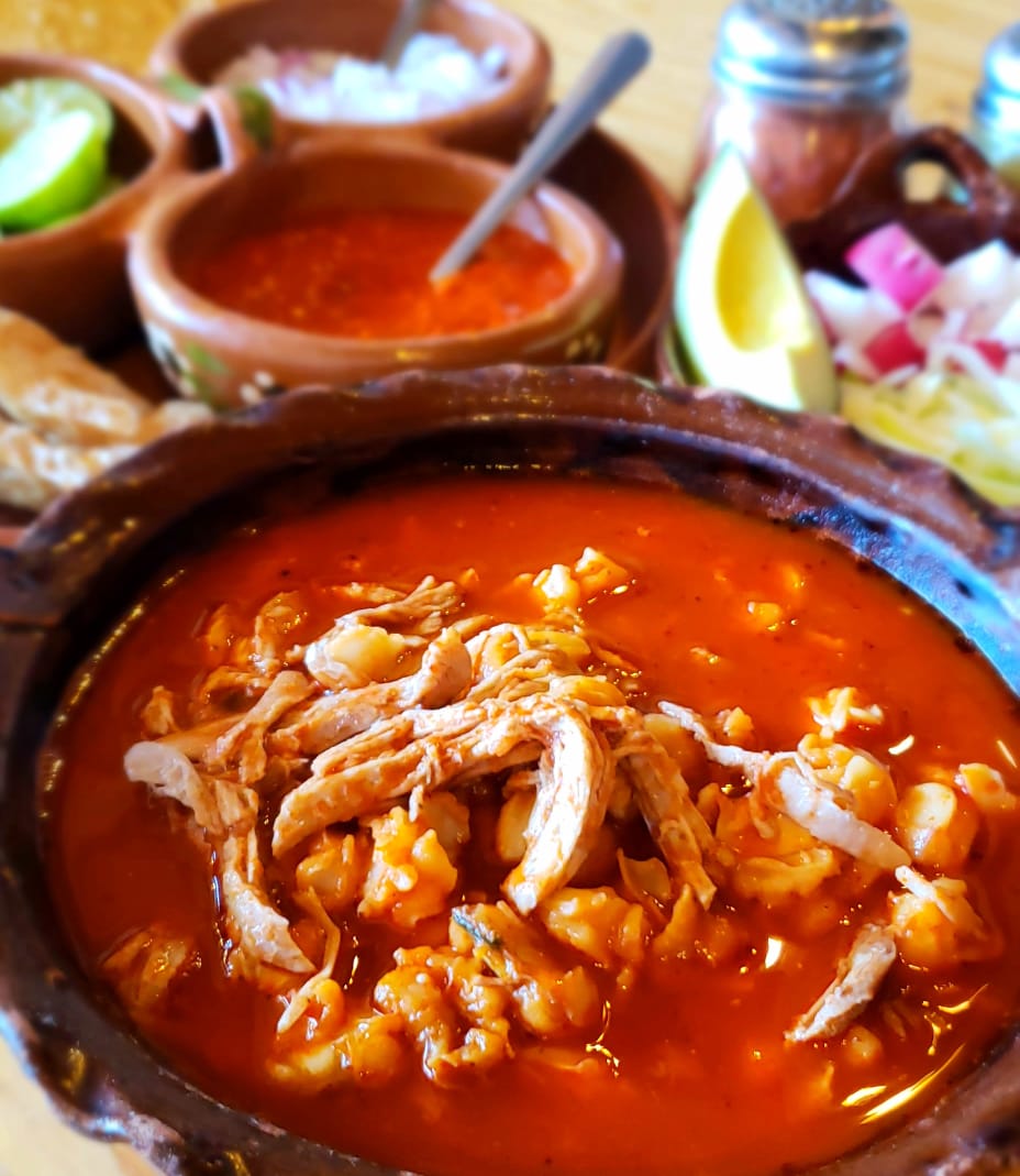Pozole rojo, con nuestra deliciosa receta. acompañado con tostadas, chicharrón, aguacate, cebolla, limón, verdura, chile y orégano.