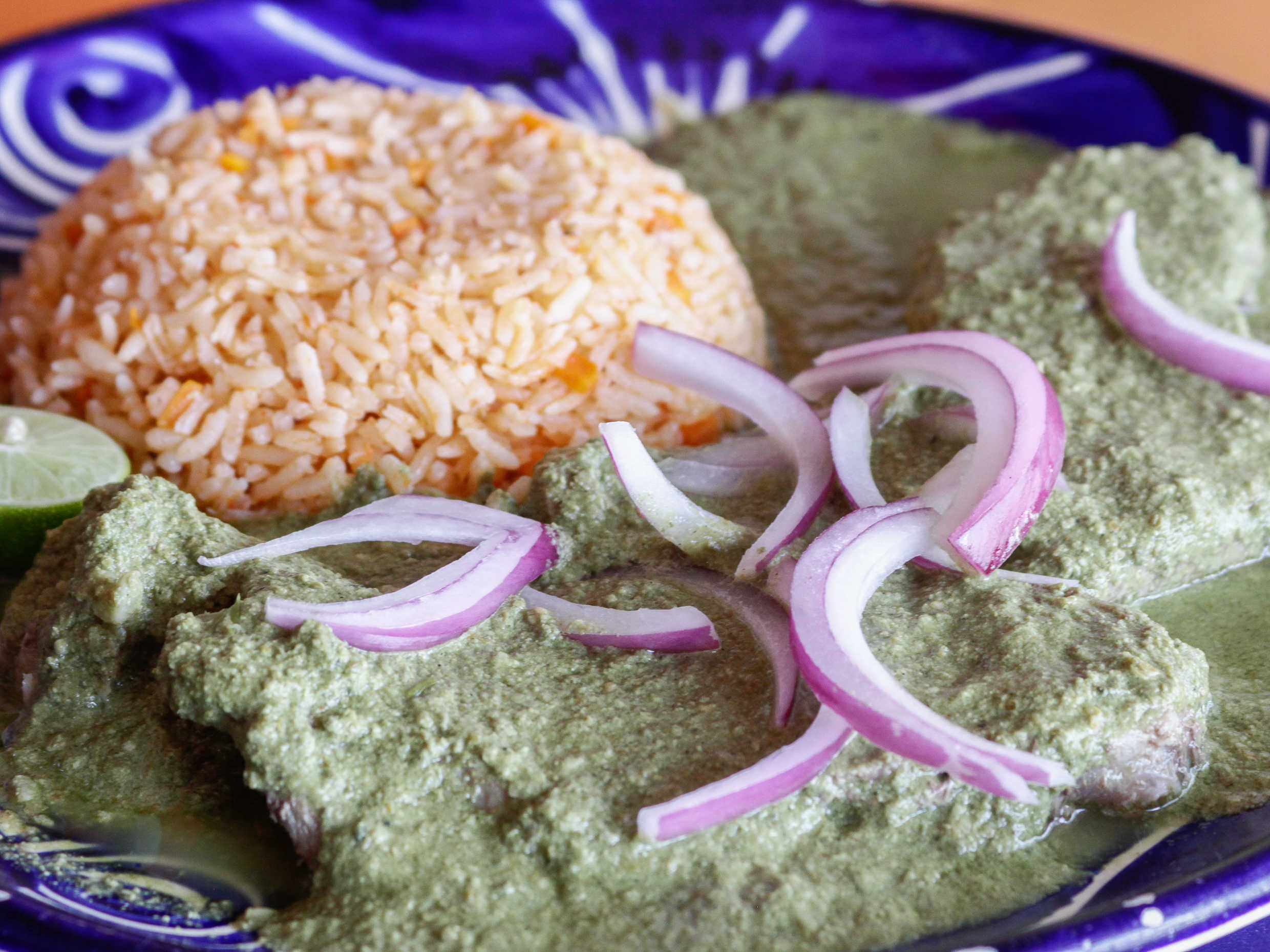 Preparado con una pasta a base de semilla de calabaza, tomate y chiles, se puede servir con pollo o espinazo, salpicado de cebolla morada y arroz.