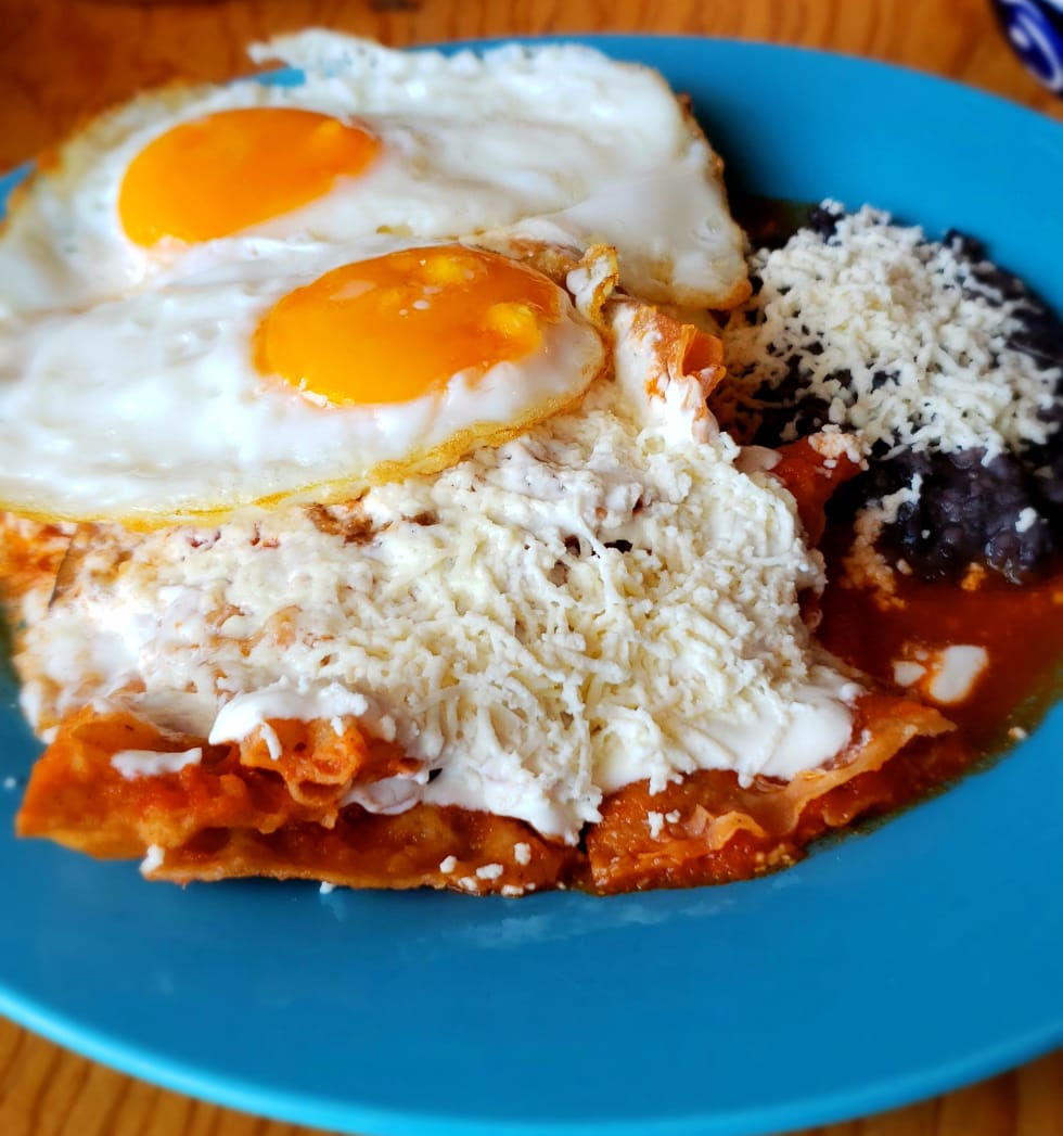 2 Huevos estrellados sobre tortilla dorada y untada con frijoles. Bañados en salsa de jitomate y salsa verde, crema, queso y cebolla.
