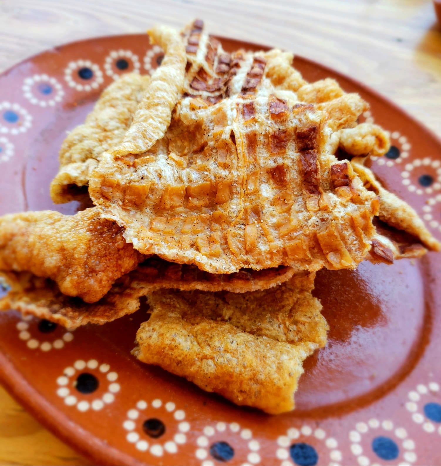 Cazuelitas de maíz doradas, servidas con pollo, aguacate, cebolla morada, chipotle dulce y caldito.