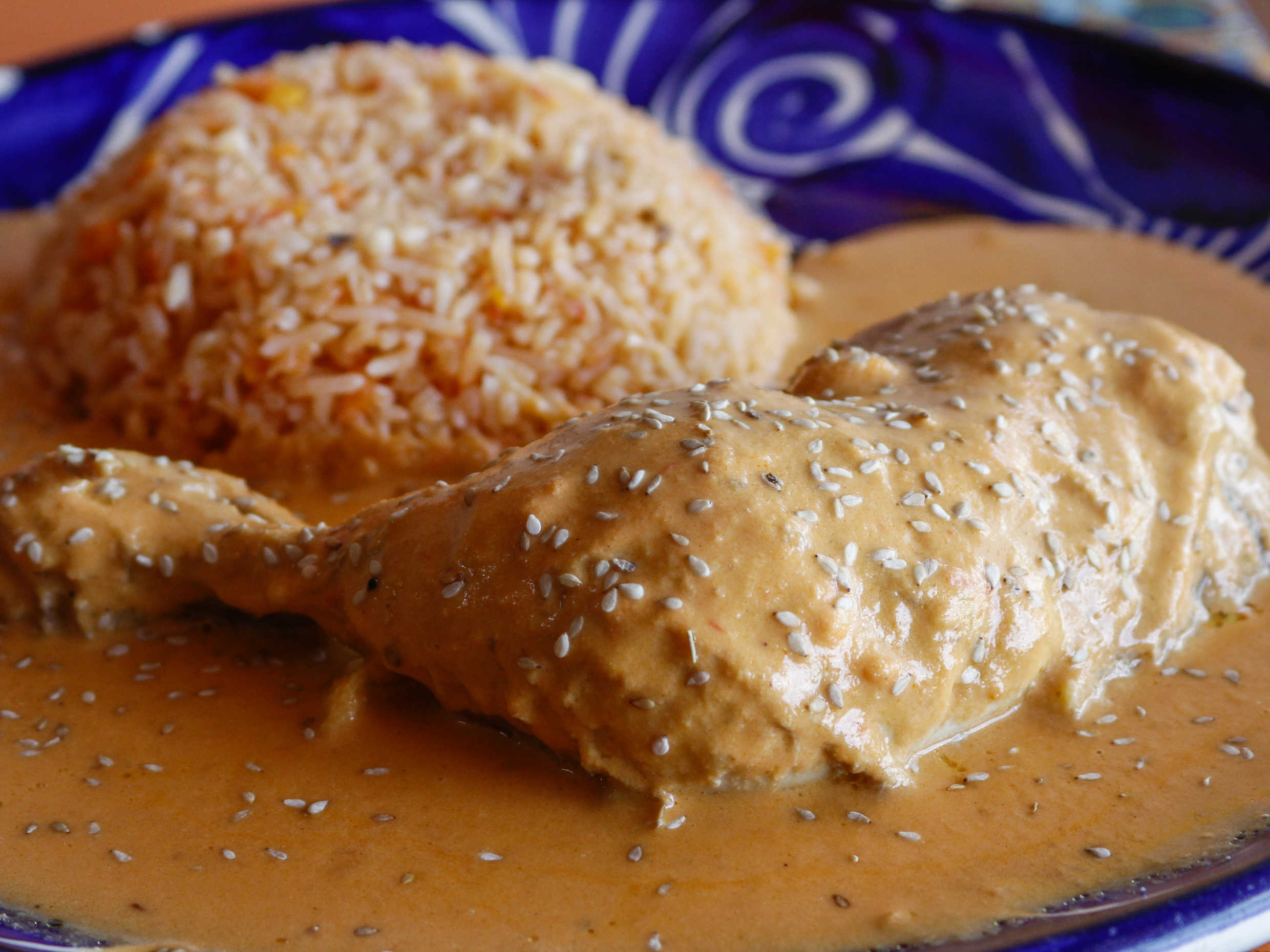 Pierna con muslo, bañado en una salsa de cacahuate, se acompaña con arroz.