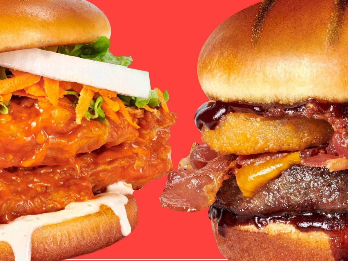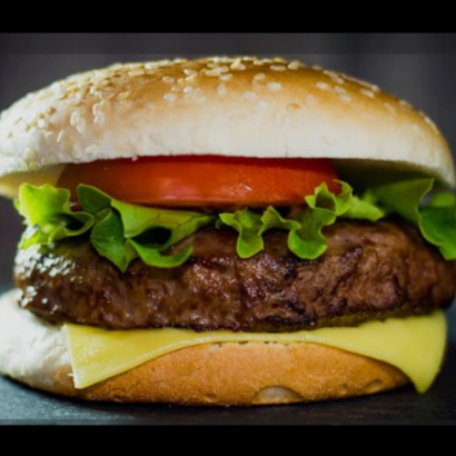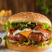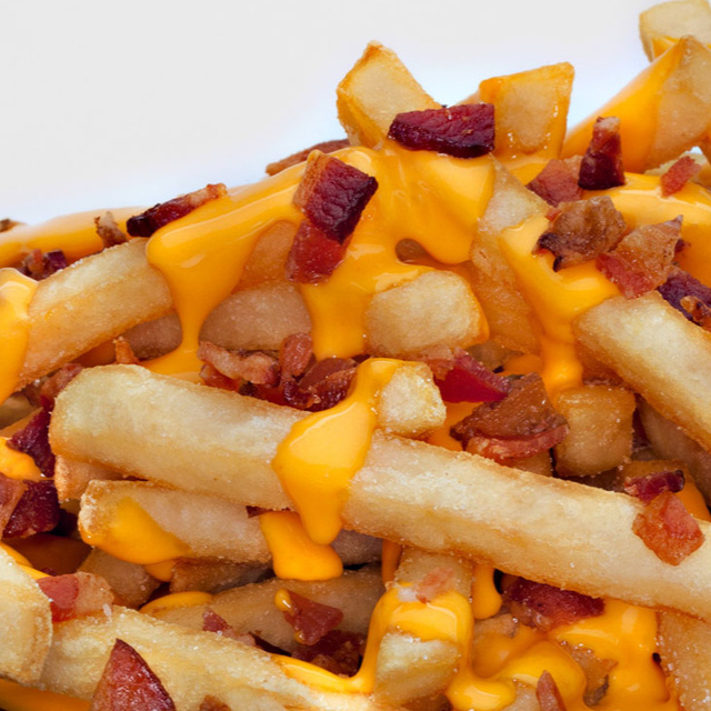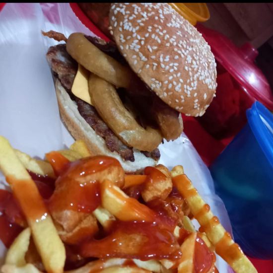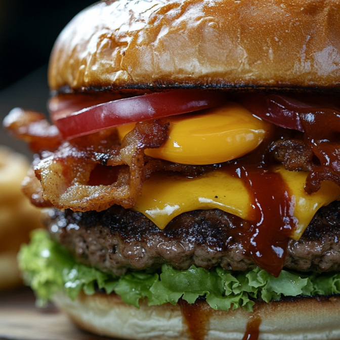 Carne, queso amarillo, aros de cebolla fritos, tocino, salsa BBQ