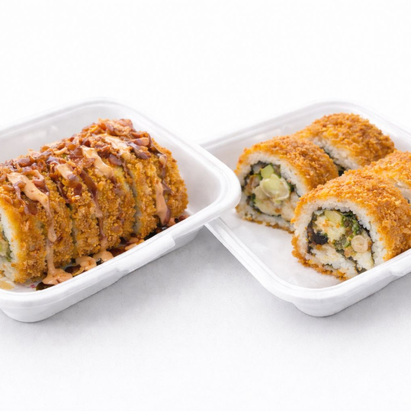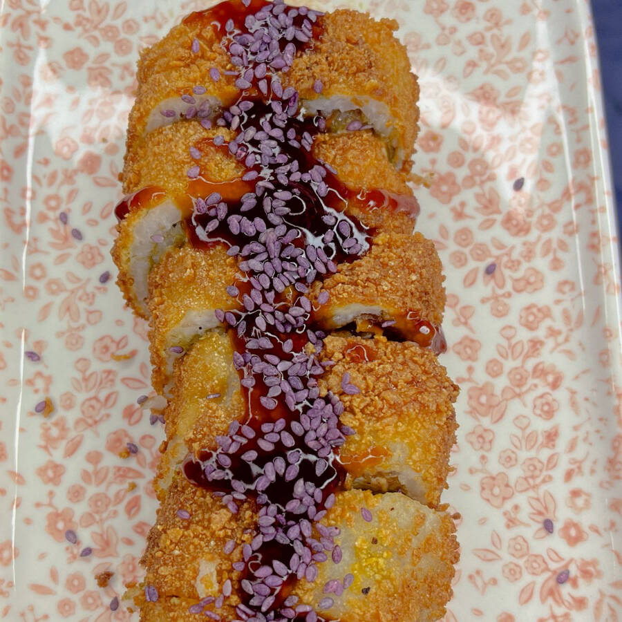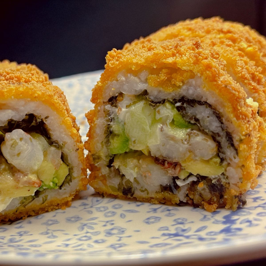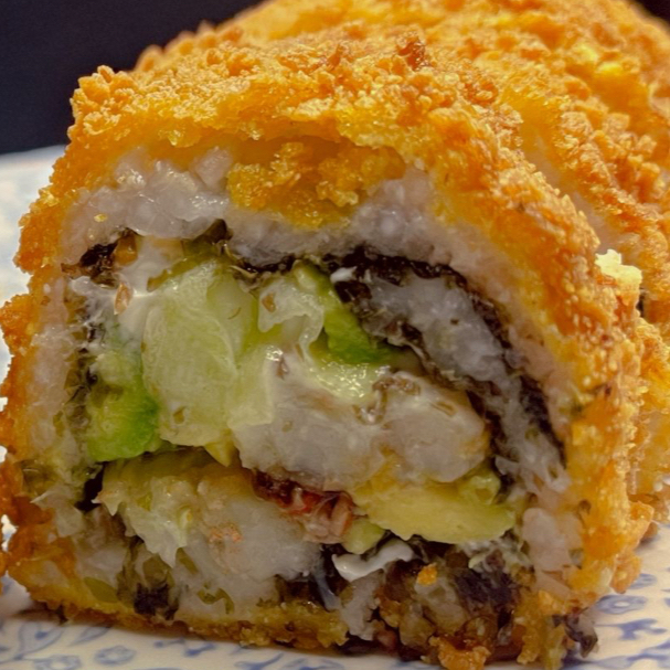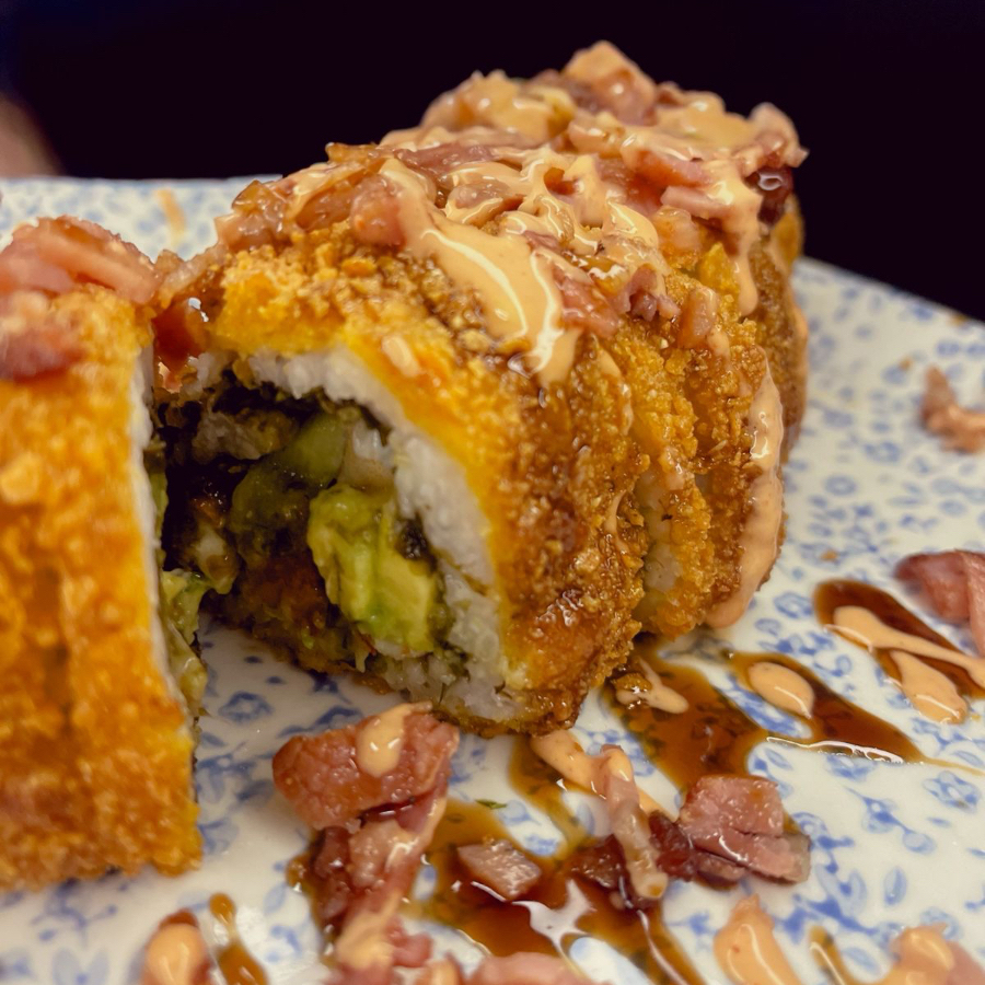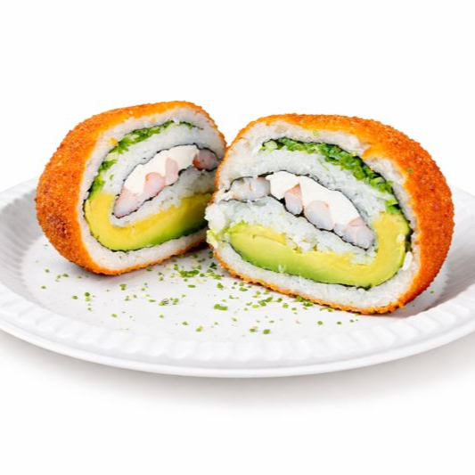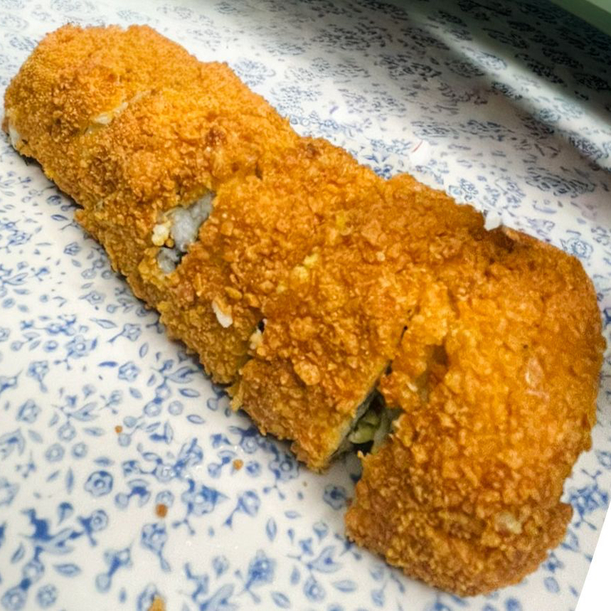 exquisito rollo empanizado con tocino relleno de Philadelphia,camaron pepino y aguacate