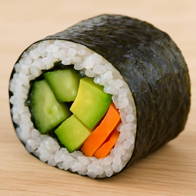 Delicioso rollo vegetariano relleno de pepino, aguacate y zanahoria