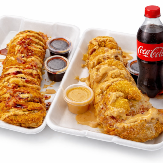 Delicioso camaròn empanizado bañado en salsa especial + queso manchego relleno de Philadelphia , surimi y pepino