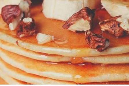 Deliciosa mezcla de huevo estrellado, tocino y hot cakes con mantequilla