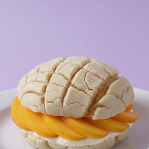 Concha de vainilla rellena de duraznos con crema