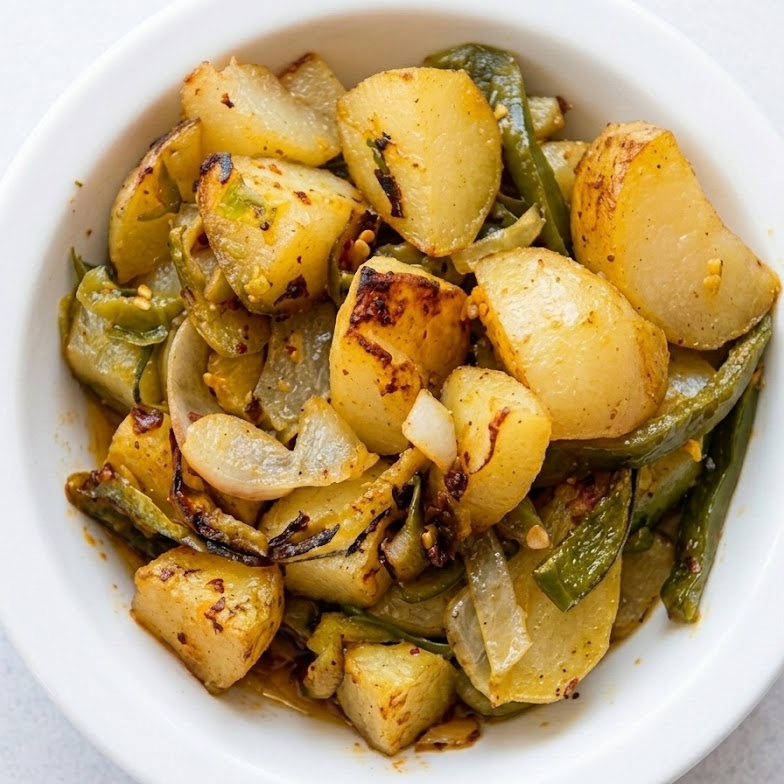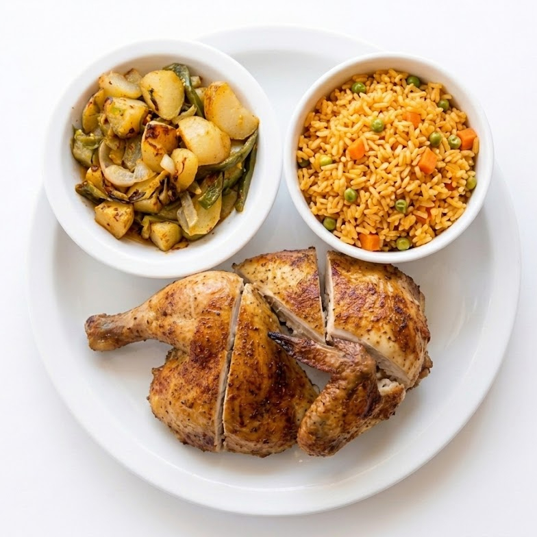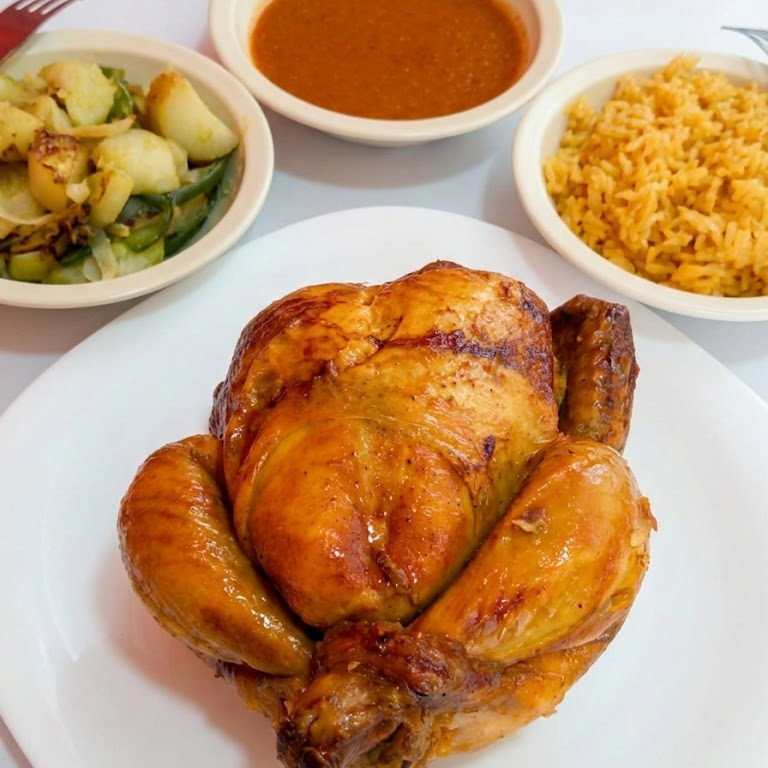 Pollo rostizado bañado con salsa de chile ajo, acompañado con arroz o papas y salsa.