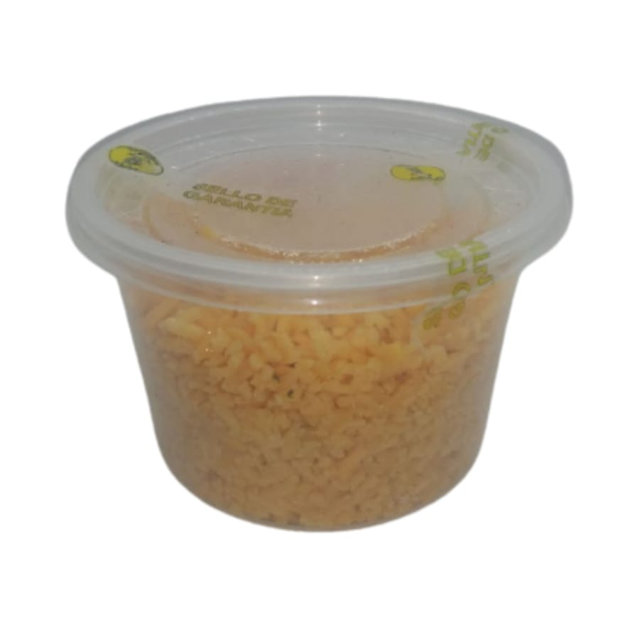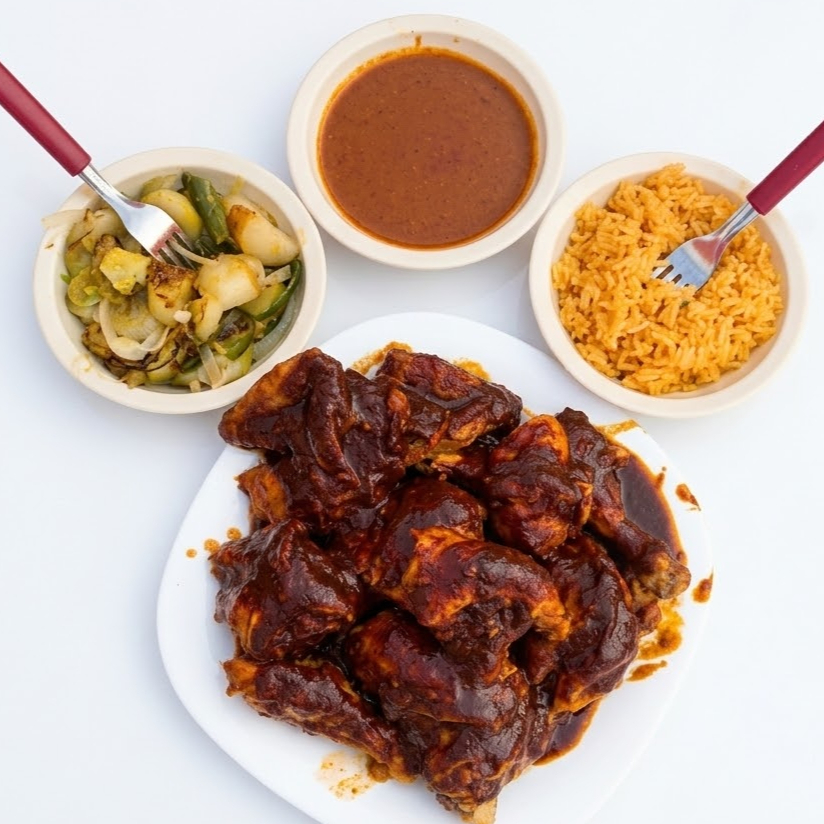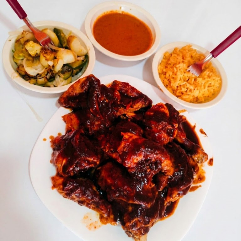 Pollo rostizado enchilado, acompañado con arroz o papas y salsa.