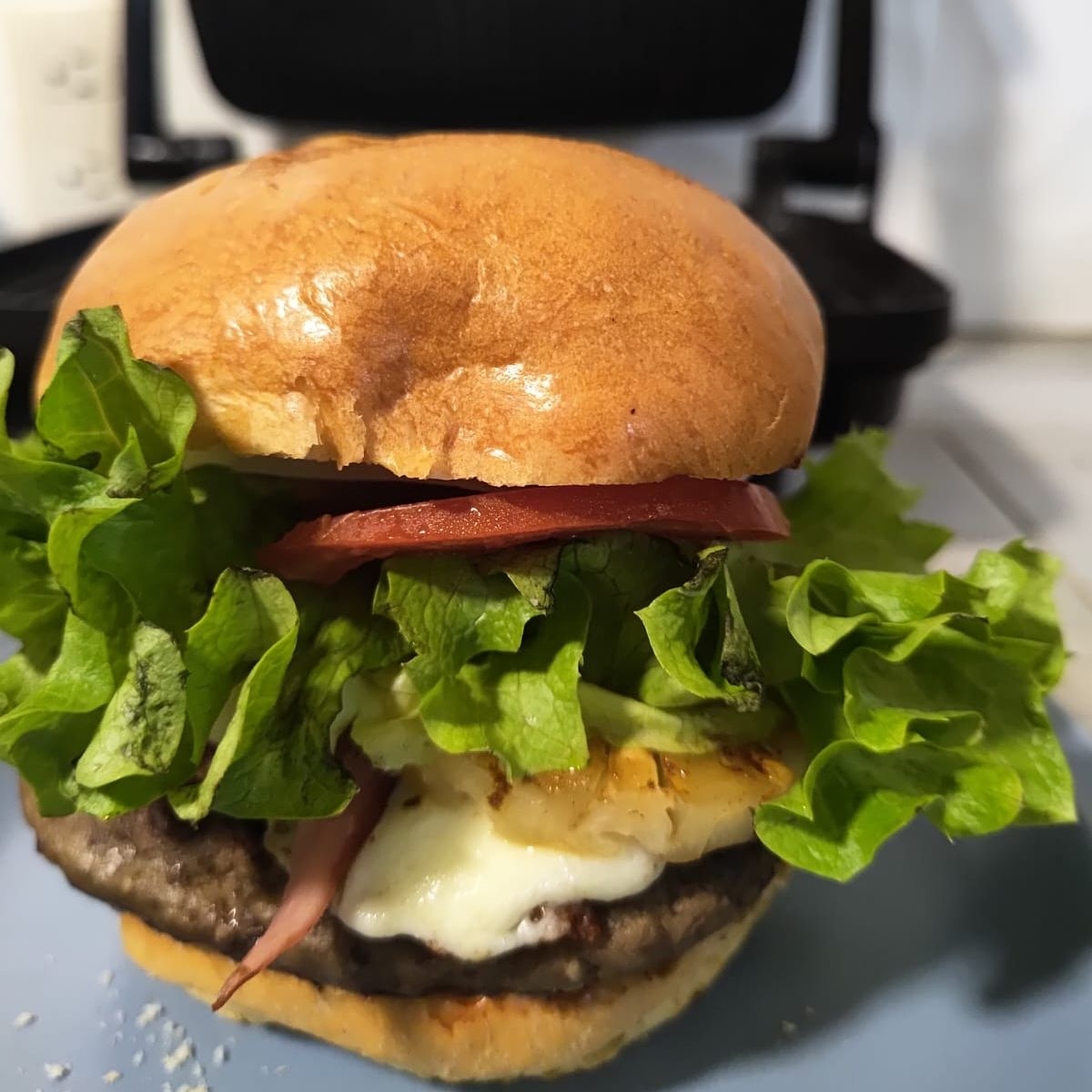 Hamburguesa con Carne de Res, Jamón, Piña, Queso Oaxaca, Jitomate, Cebolla, Lechuga, Pan hamburguesa (tradicional o brioche) con Mayonesa