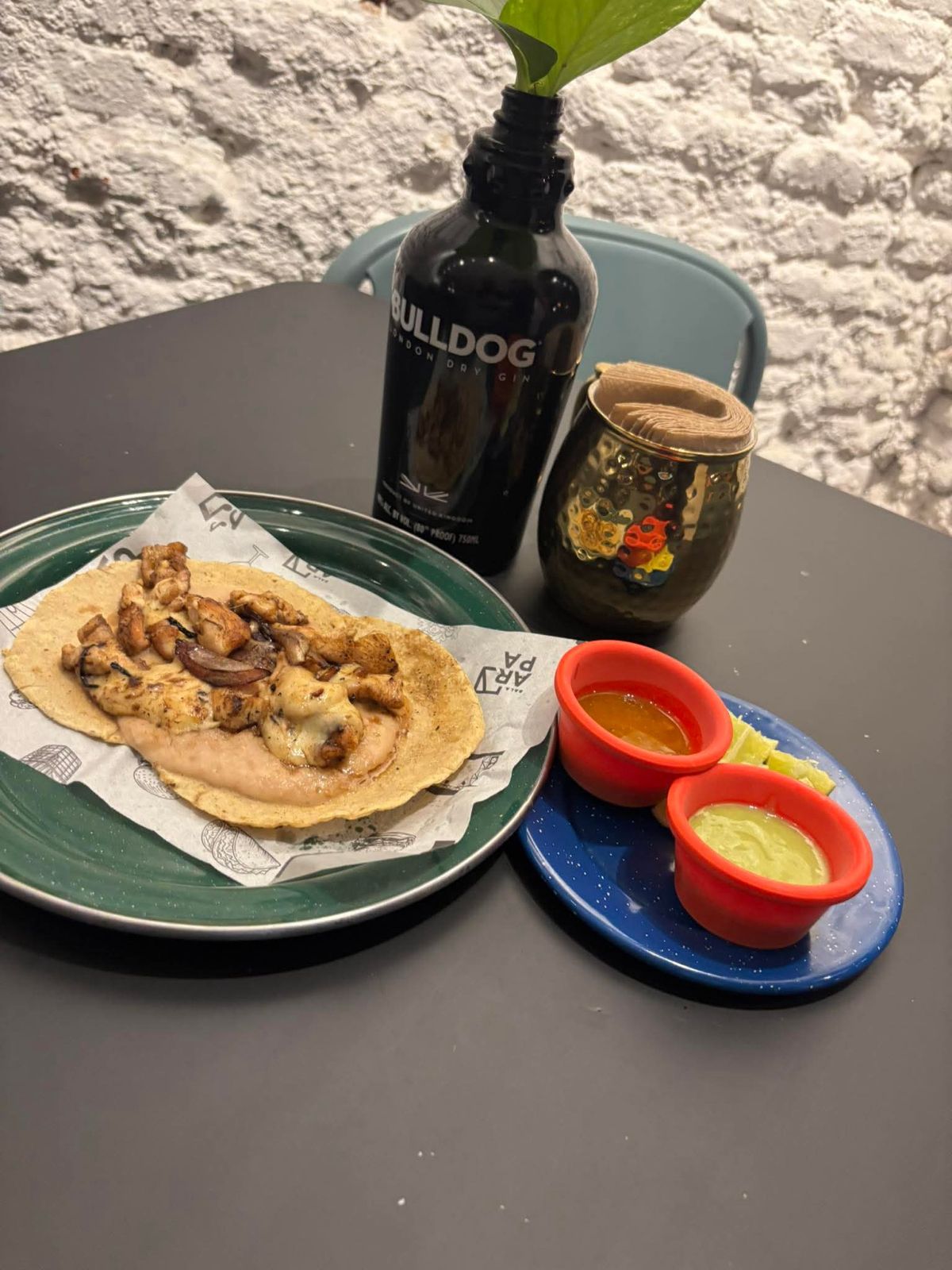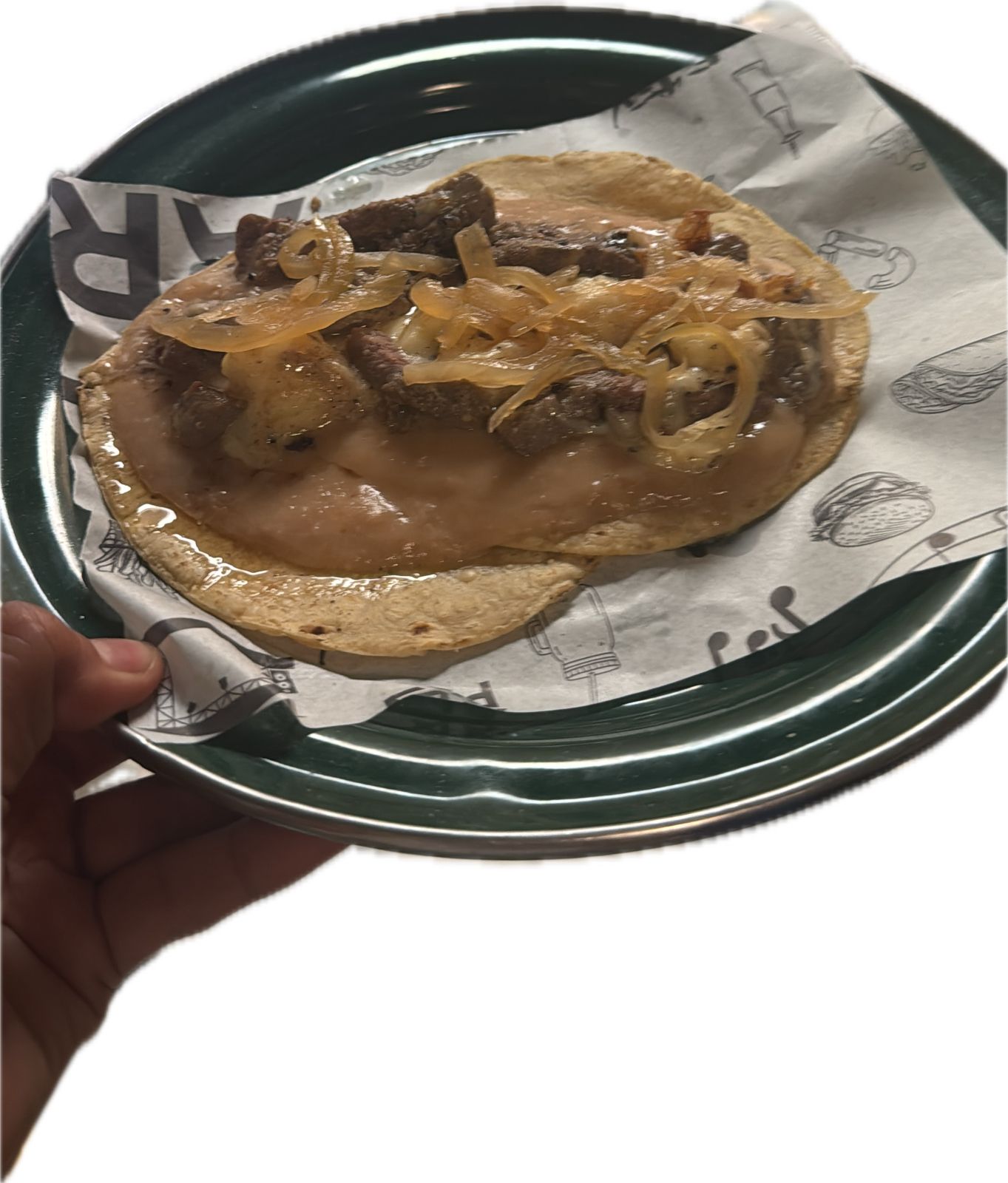 Frijol refrito negro, queso oaxaca y cebolla caramelizada.