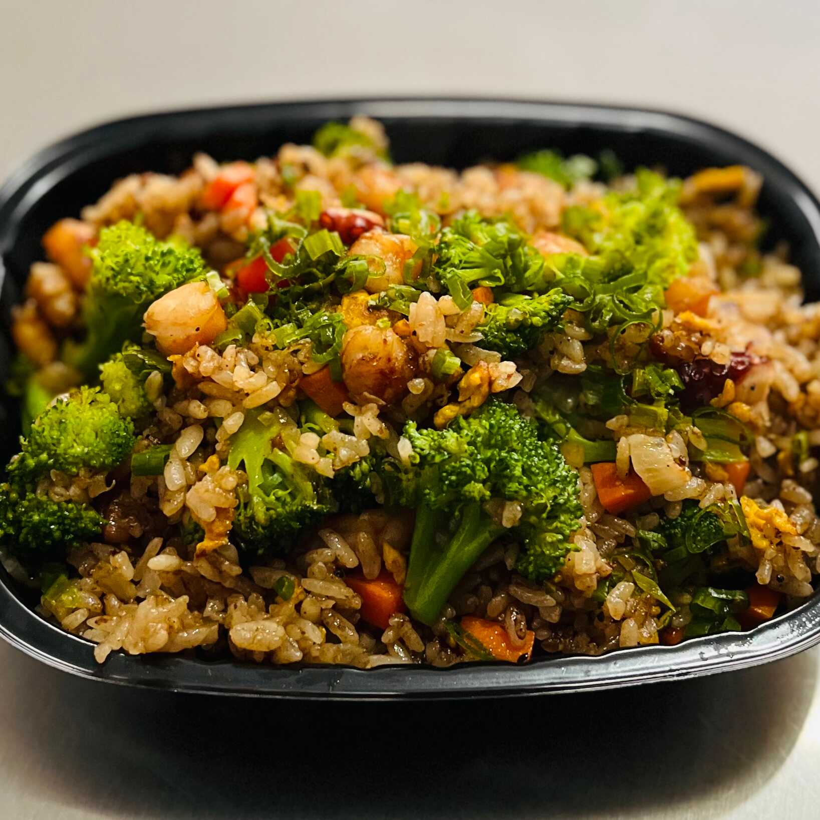Arroz frito con zanahoria, cebolla, calabaza, morrón y huevo con un toque de cebollín