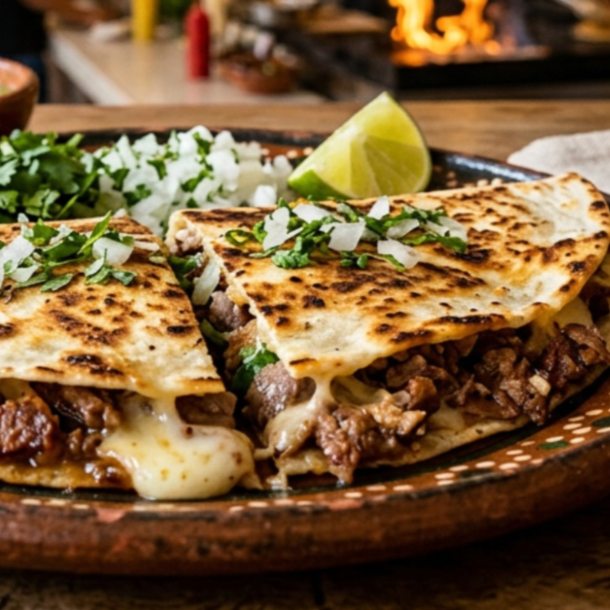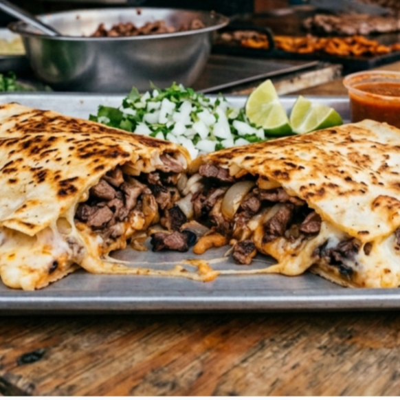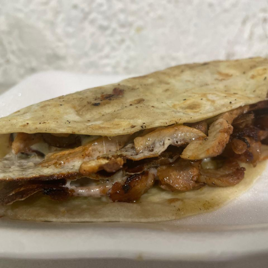 Tortilla de harina de trigo, carne de res (suadero), queso asadero, verduras y salsa al gusto