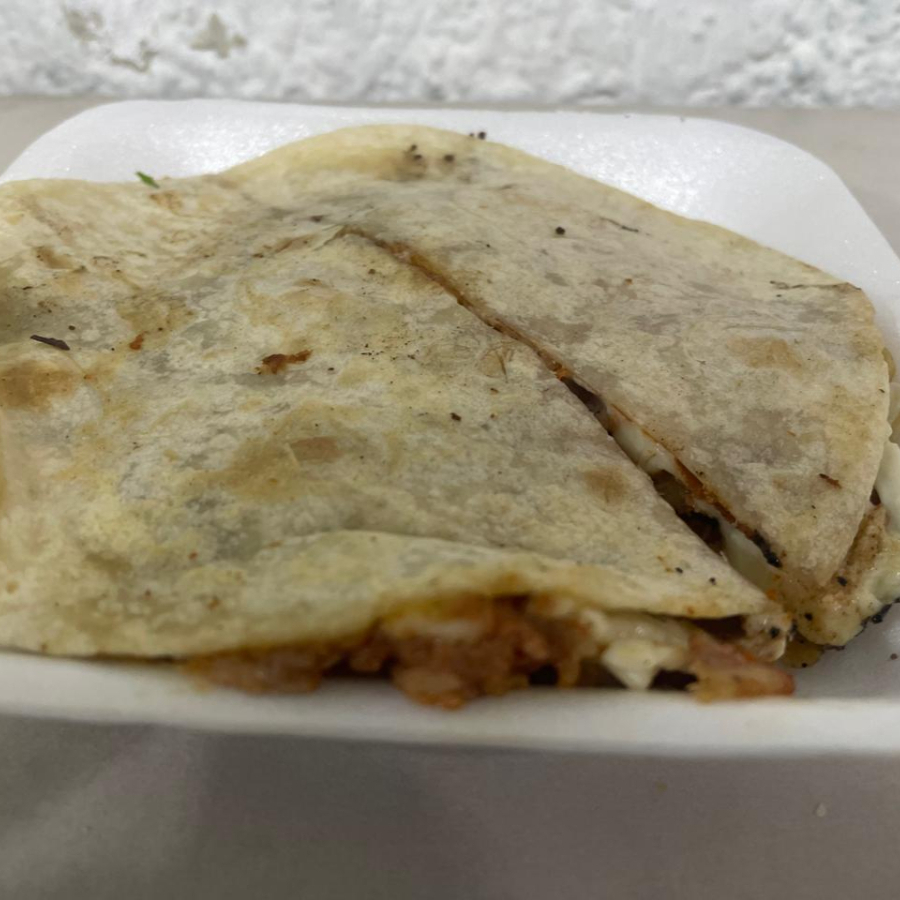 Tortilla de trigo con carne de cerdo al pastor, queso oxaca y salsa al gusto