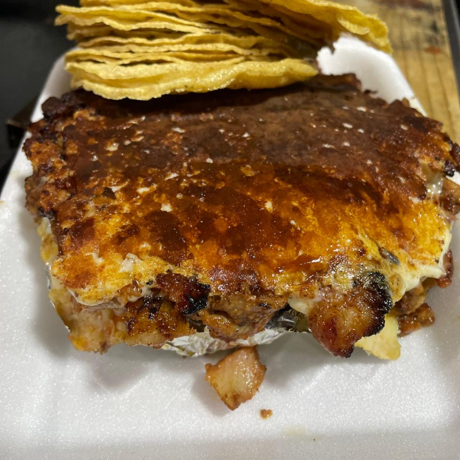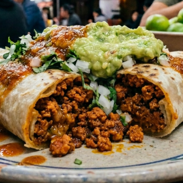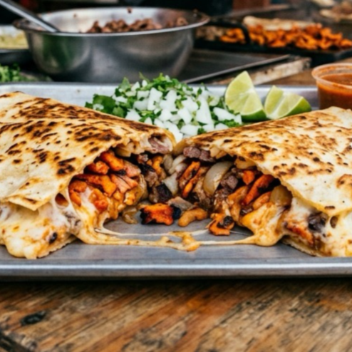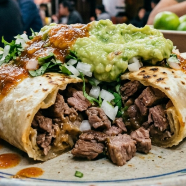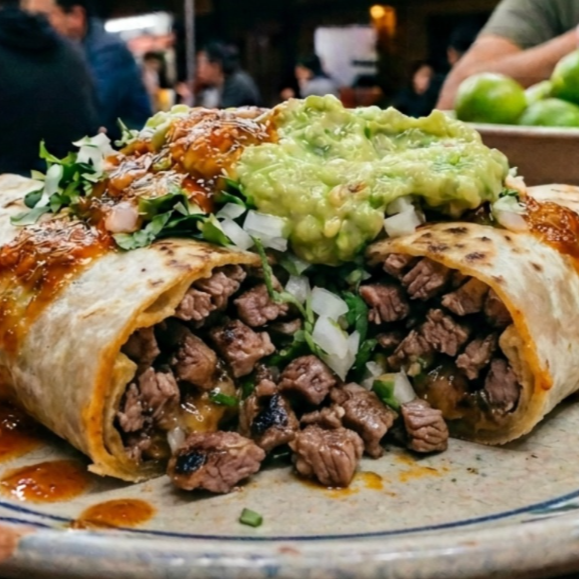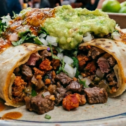 Tortilla de harina de trigo, carne de res y chorizo, queso oaxaca, tocino, verduras y salsa al gusto