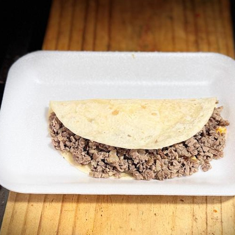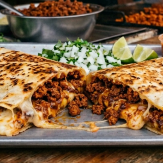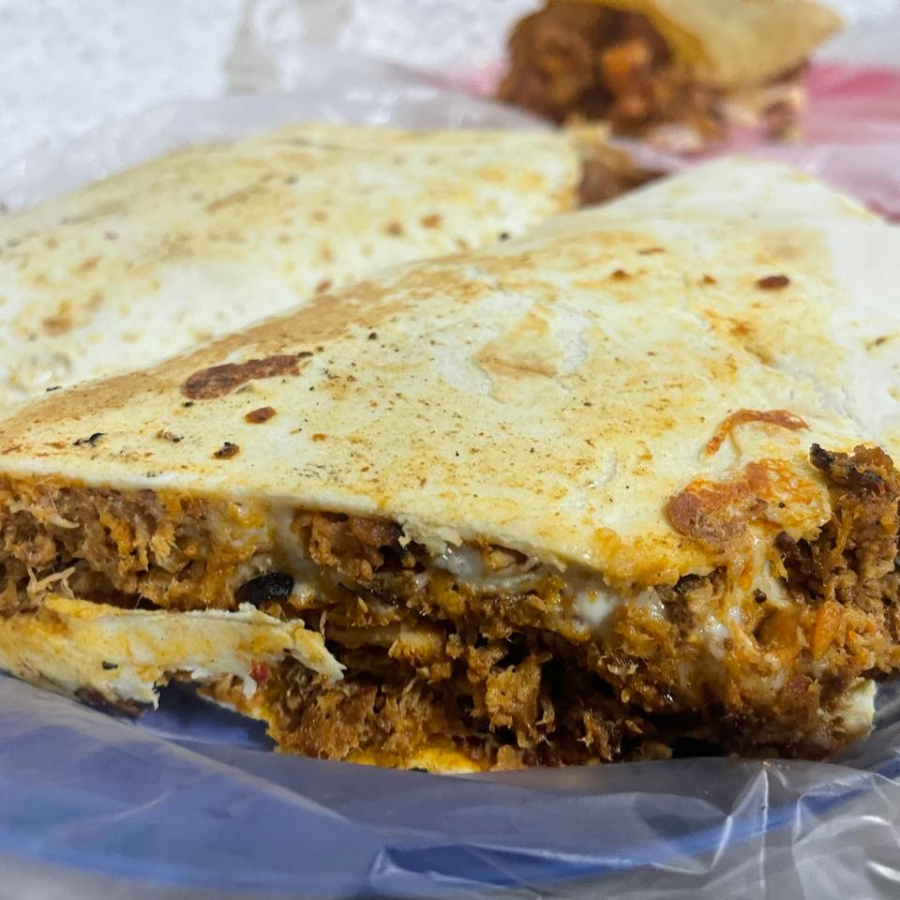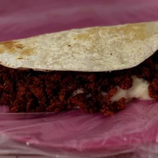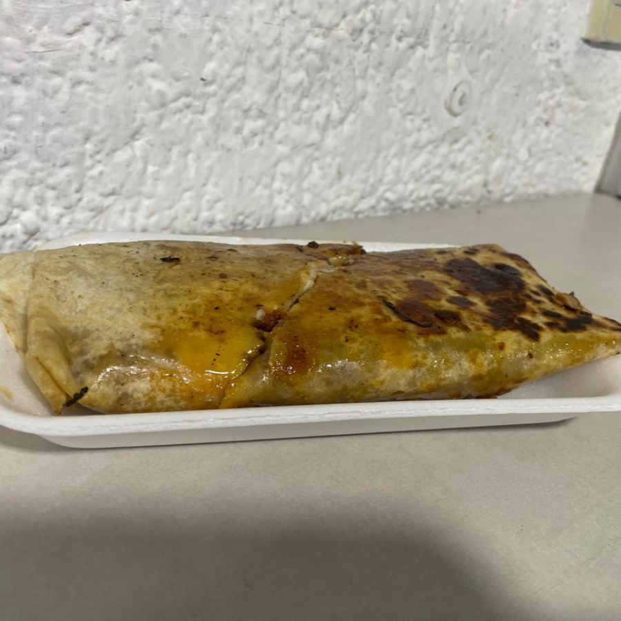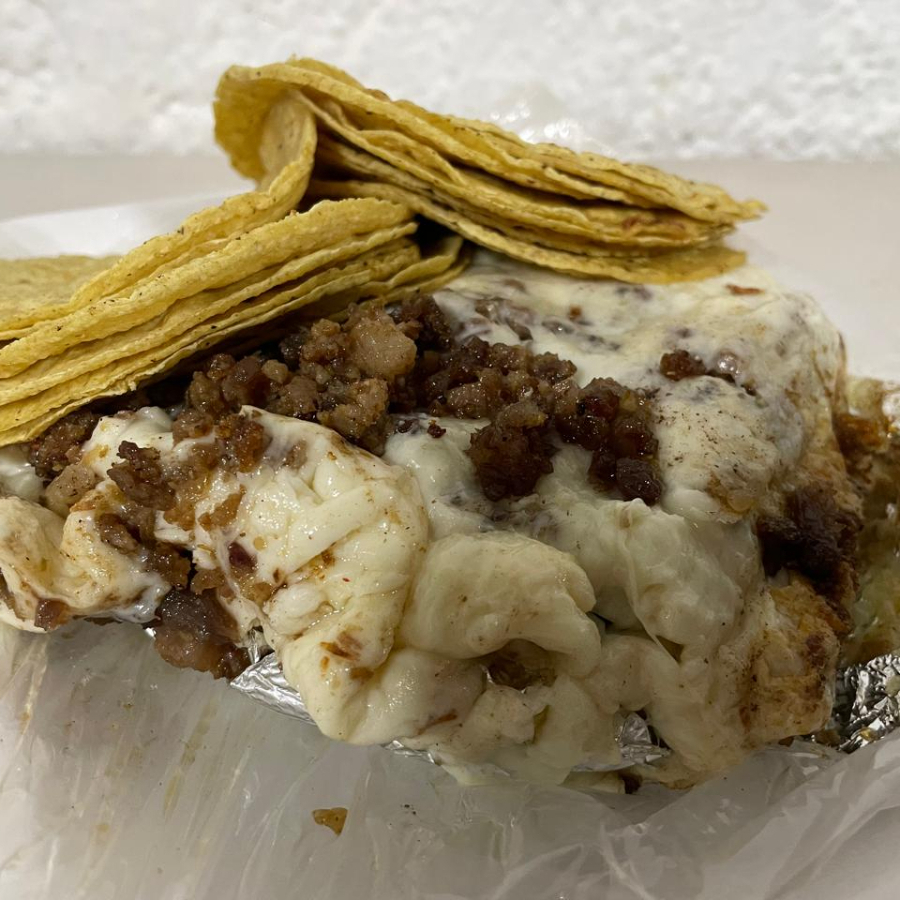 Tortilla de trigo con carne de res y chorizo, queso oxaca y salsa al gusto