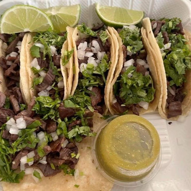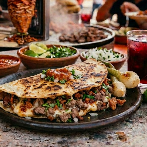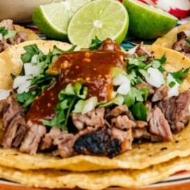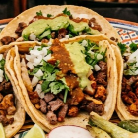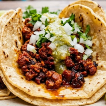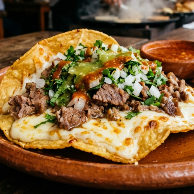 Tortilla quebradiza de maíz, carne de res (suadero), queso oxaca, verduras y salsas a su gusto