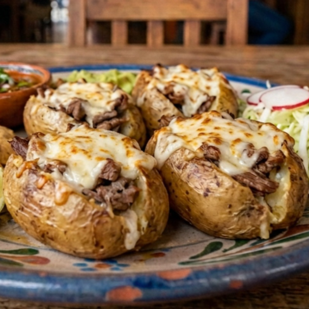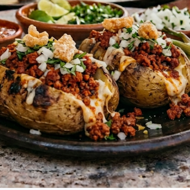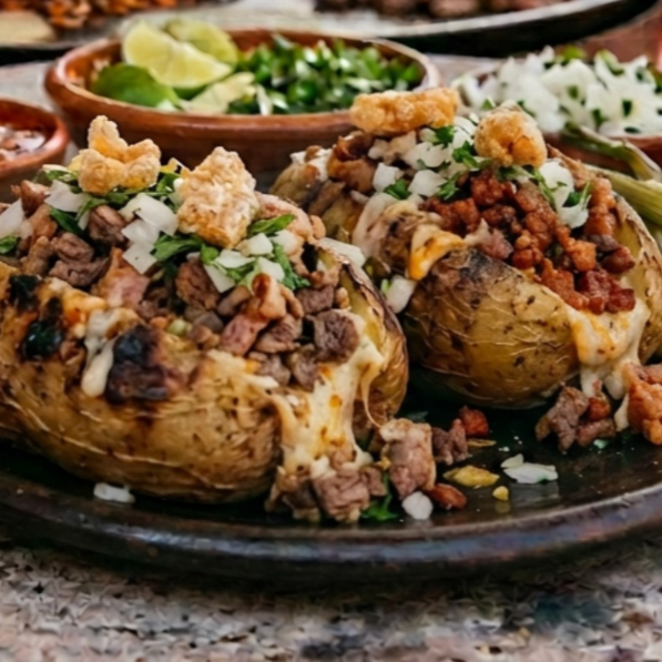 Papa rellena con carne de cerdo al pastor y queso oxaca