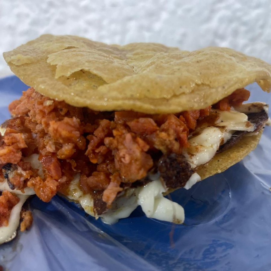 Tortilla de maíz con chorizo y carne de res, verduras y salsa al gusto