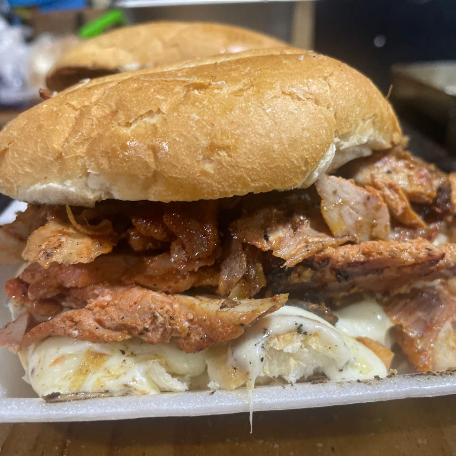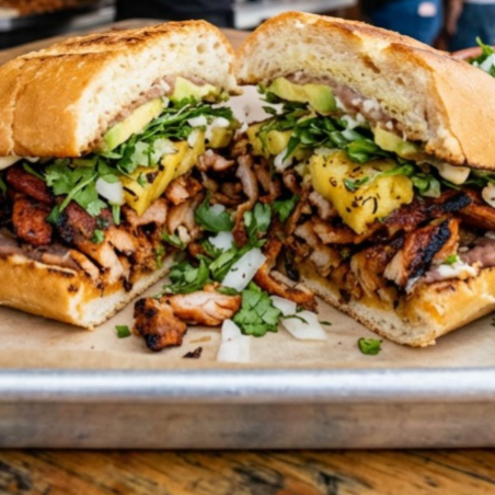 Pan, carne de cerdo al pastor, queso oaxaca y salsas al gusto