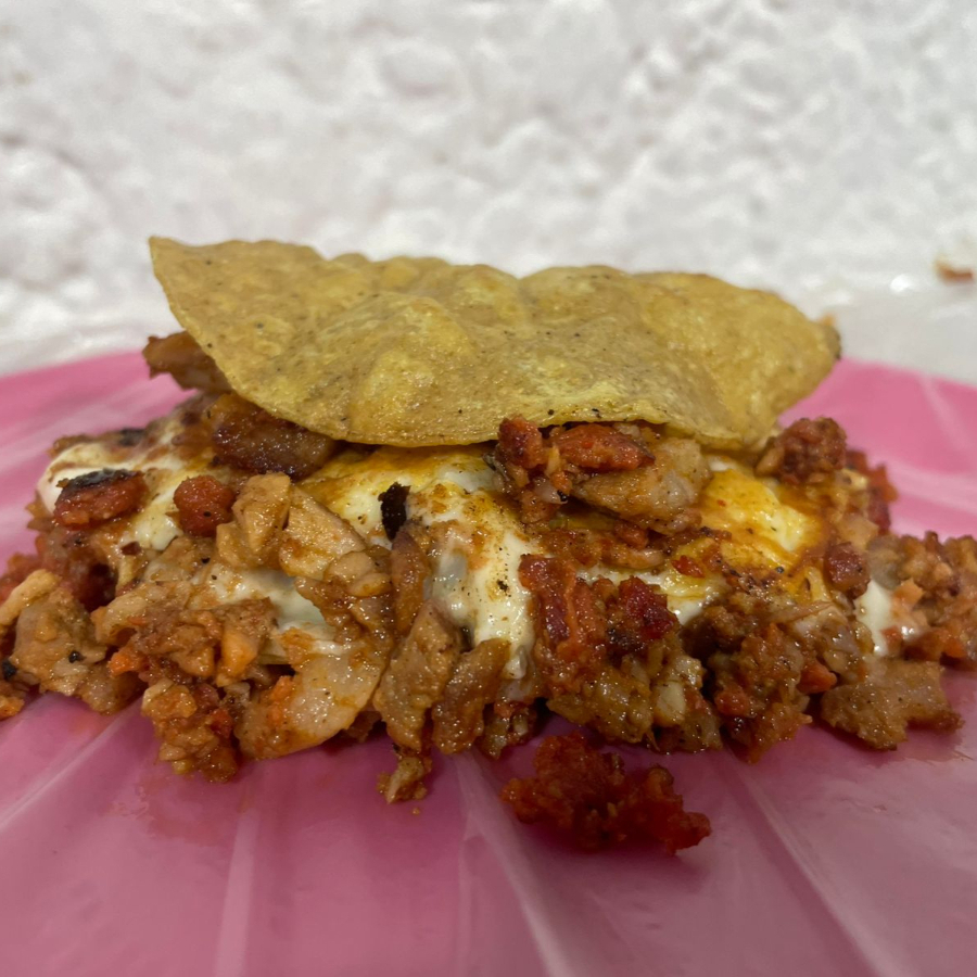 Tortilla quebradiza de maíz, chorizo, queso oxaca, verduras y salsas a su gusto