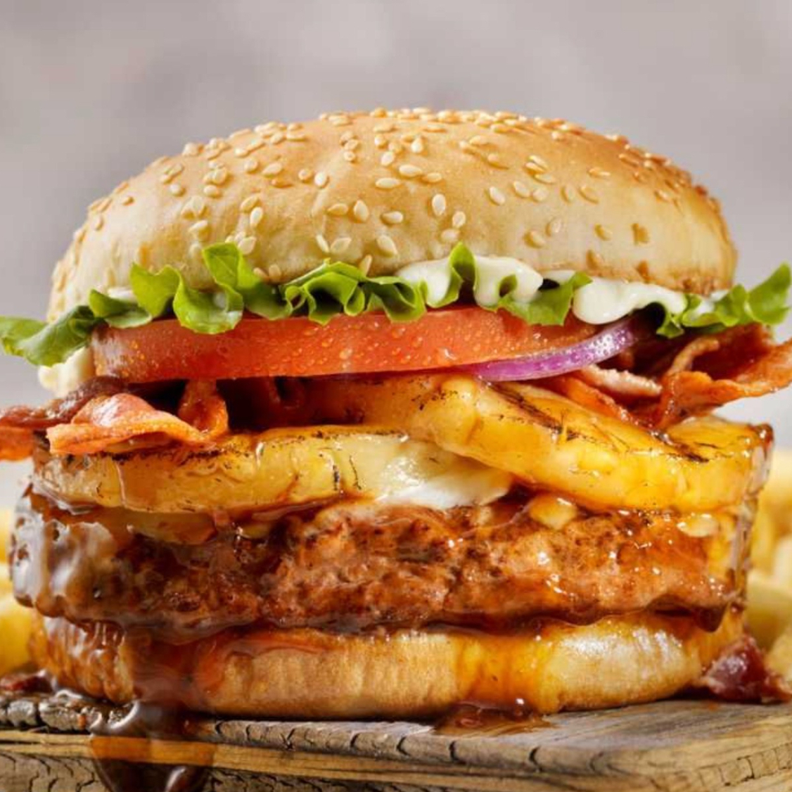 Pan de hambrguesa, pastor, salsas catpsu y mayonesa, jalapeños