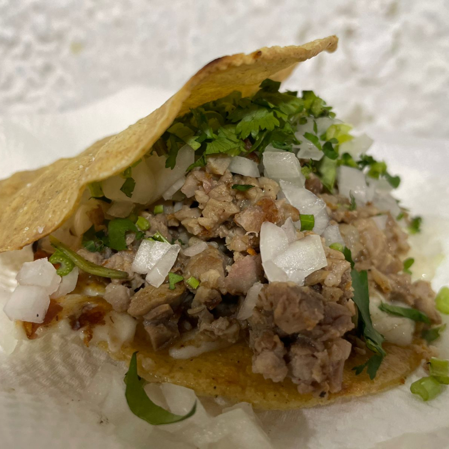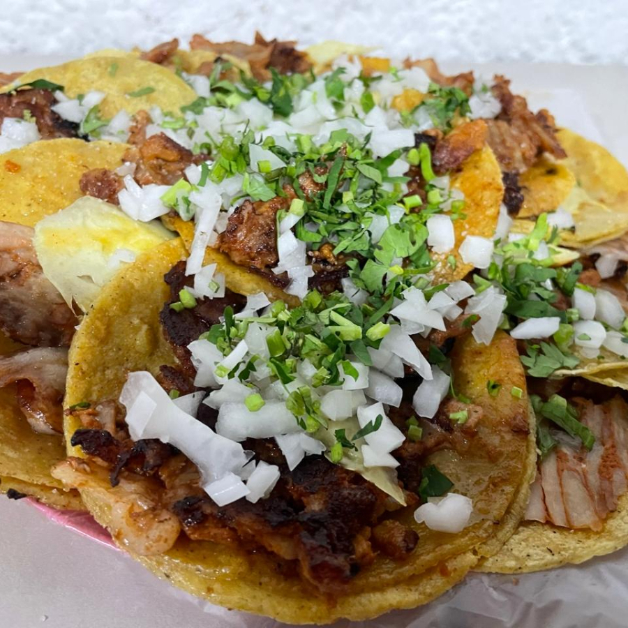 Tortilla quebradiza de maíz, carne de cerdo al pastor, queso oxaca, verduras y salsas a su gusto