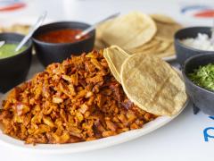 Carne al pastor, Cebolla, Chile morrón, Queso asadero, Tocino acompañado de tortillas de maíz, Salsa, Limones