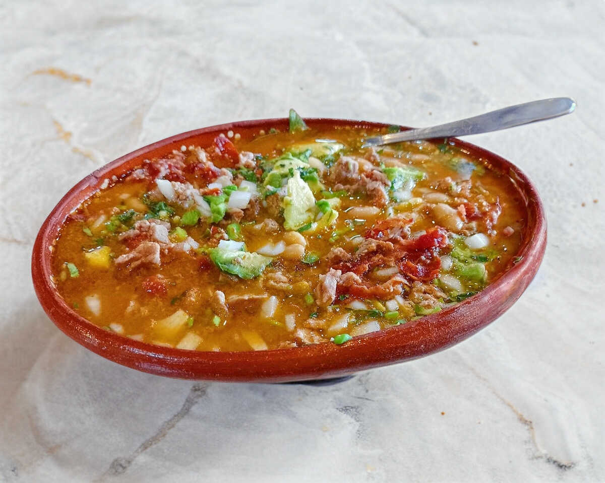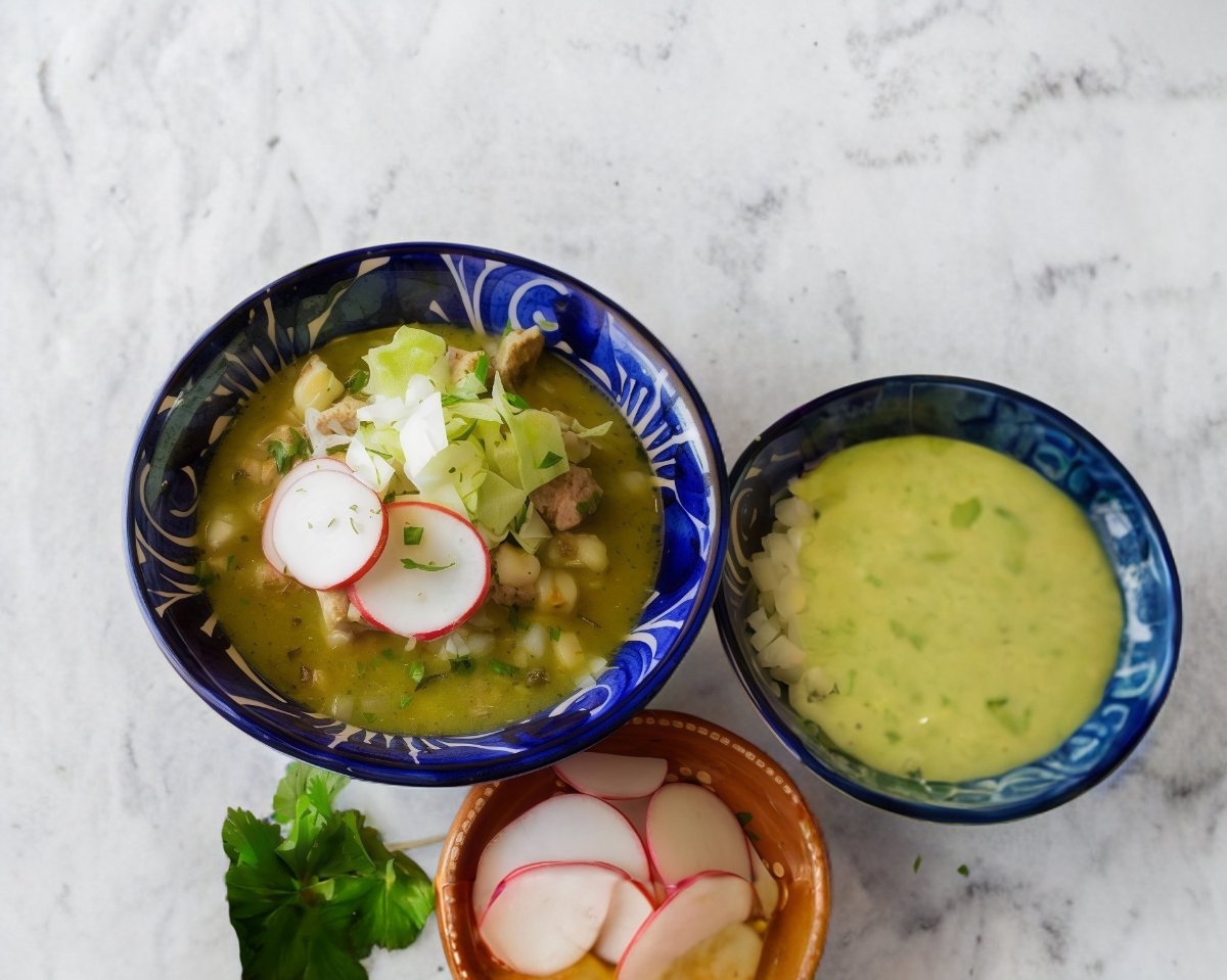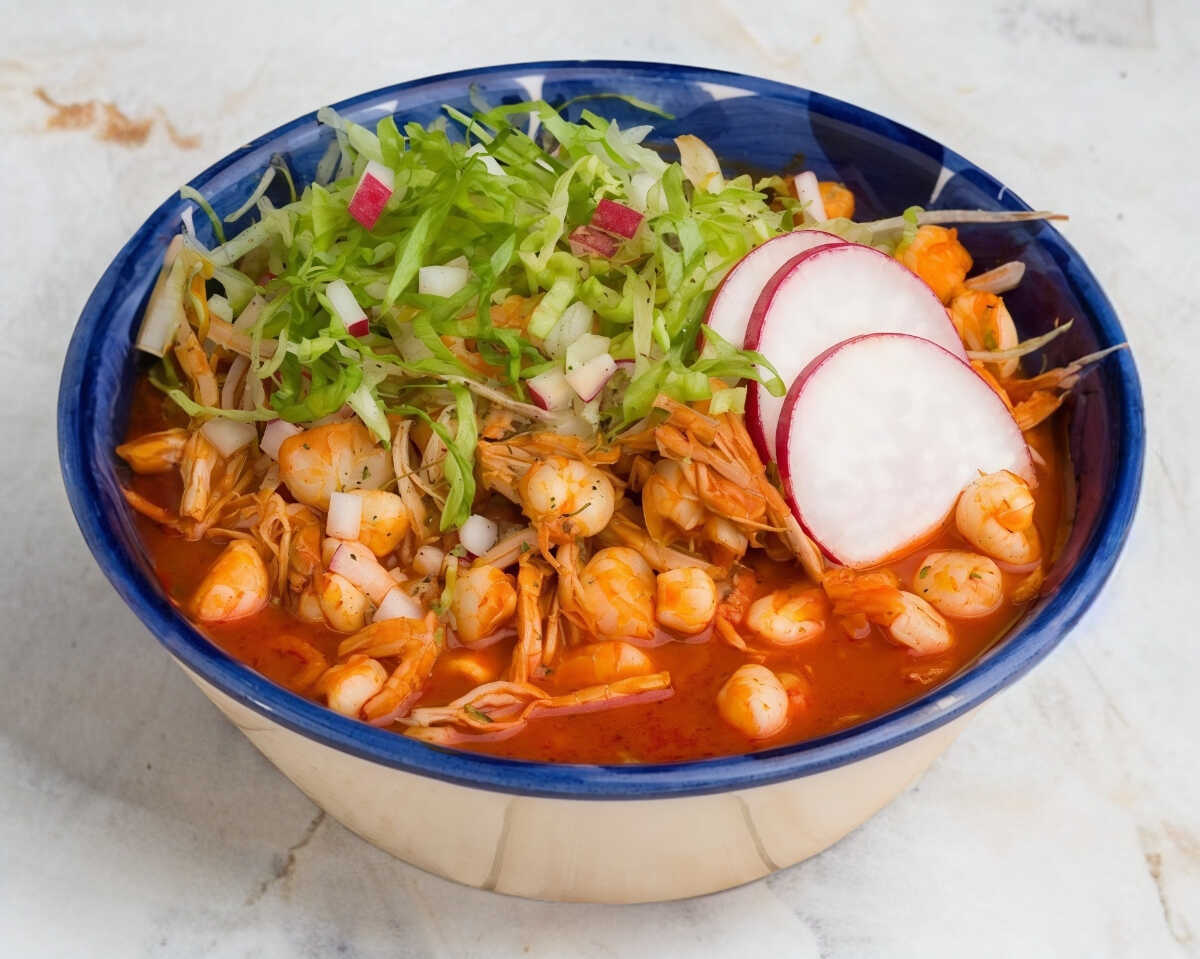 Pozole rojo con carne de cerdo, acompalado de lechuga, cebolla, rábano, orégano, limón y tostadas