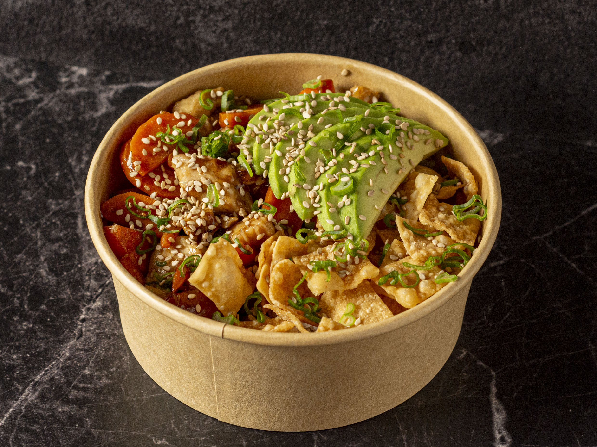 Pollo a la plancha acompañado de zanahoria, wonton, aguacate,cebollín,ajonjolí, bañado en salsa teriyaki sobre una cama de arroz