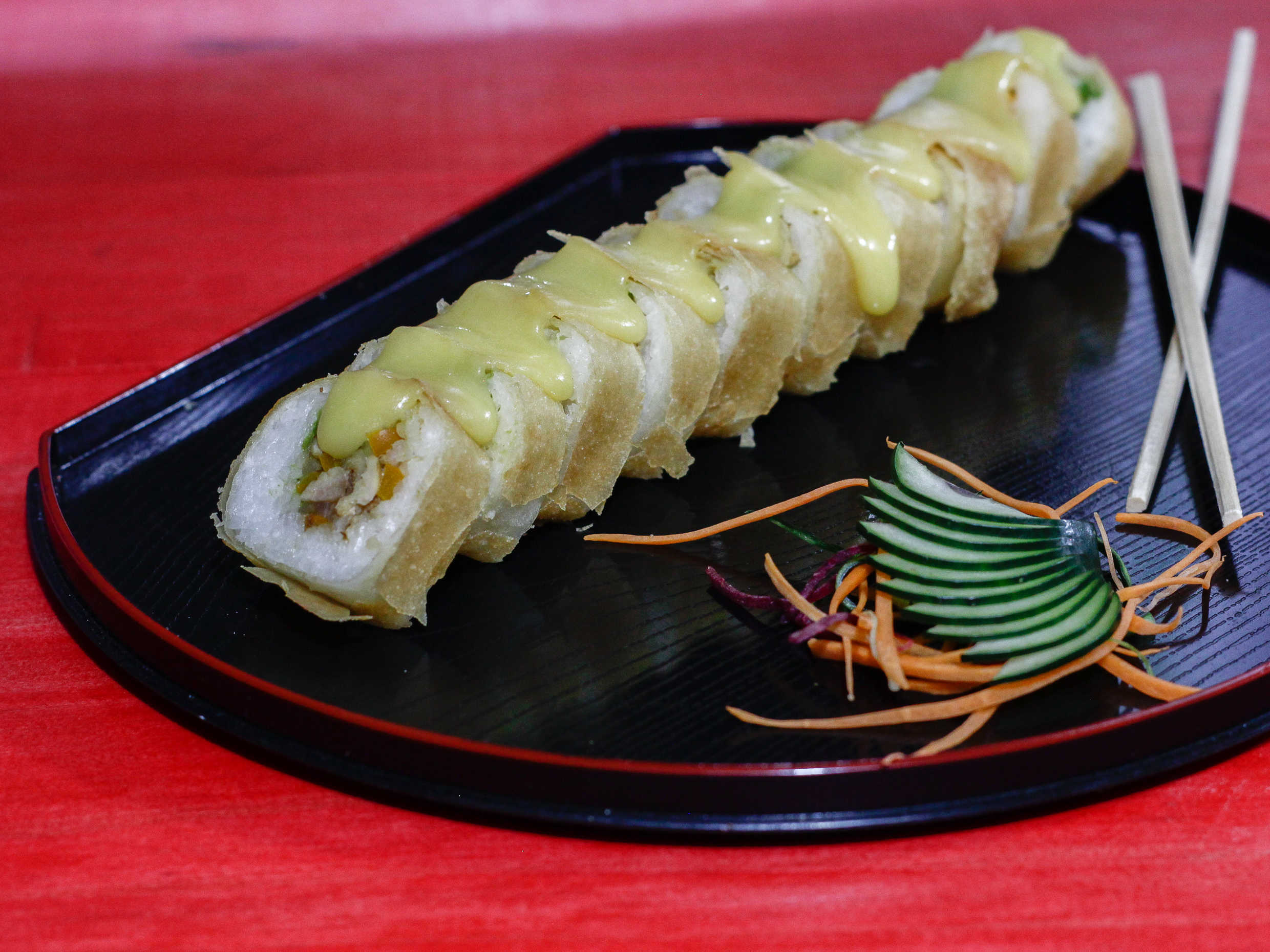 Por dentro : pollo teriyaki,aguacate,cebolla, arroz. Cubierto de hoja de wonthon y queso derretido 128