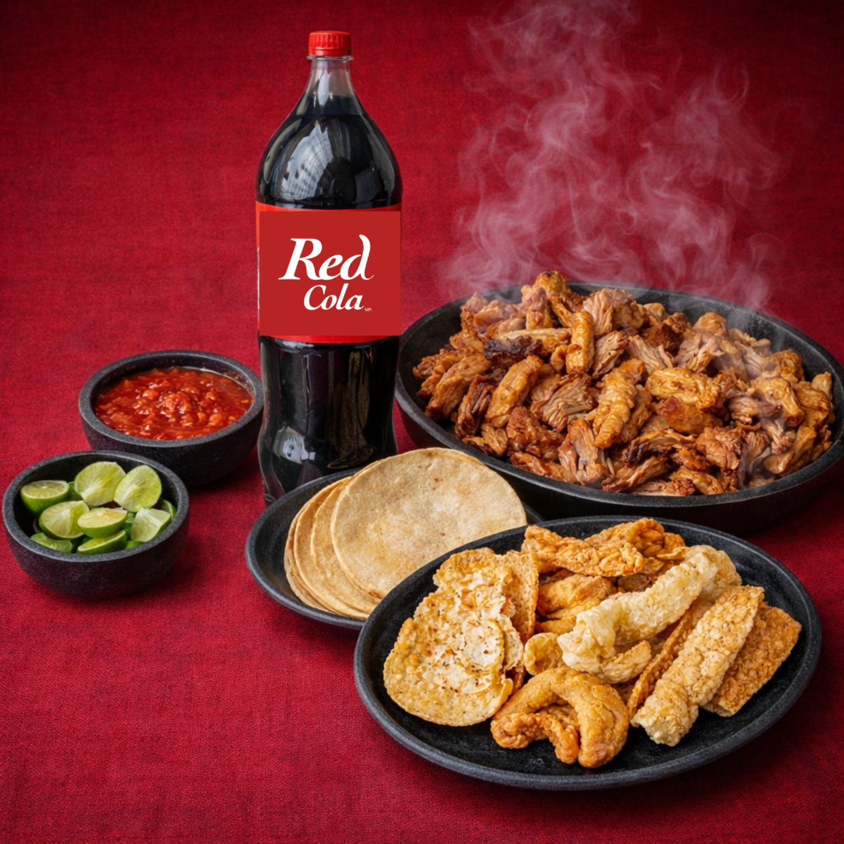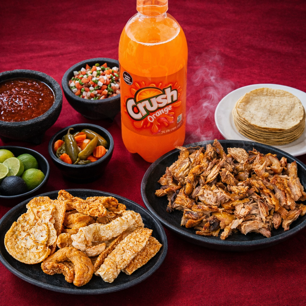 1 Kg de Carnitas 1 Kg de Tortillas 1 Refresco de 2 lt Crunch 100 gr de Chicharrón Pico de gallo Salsa Chiles en vinagre Limones