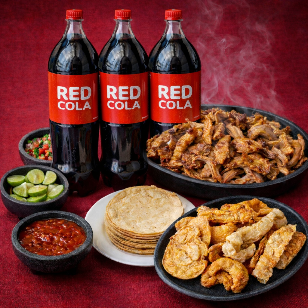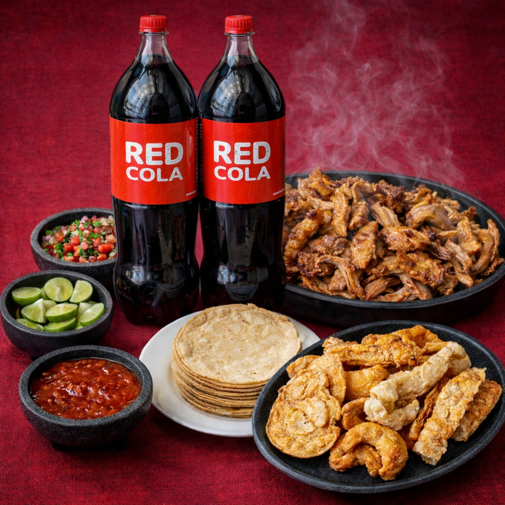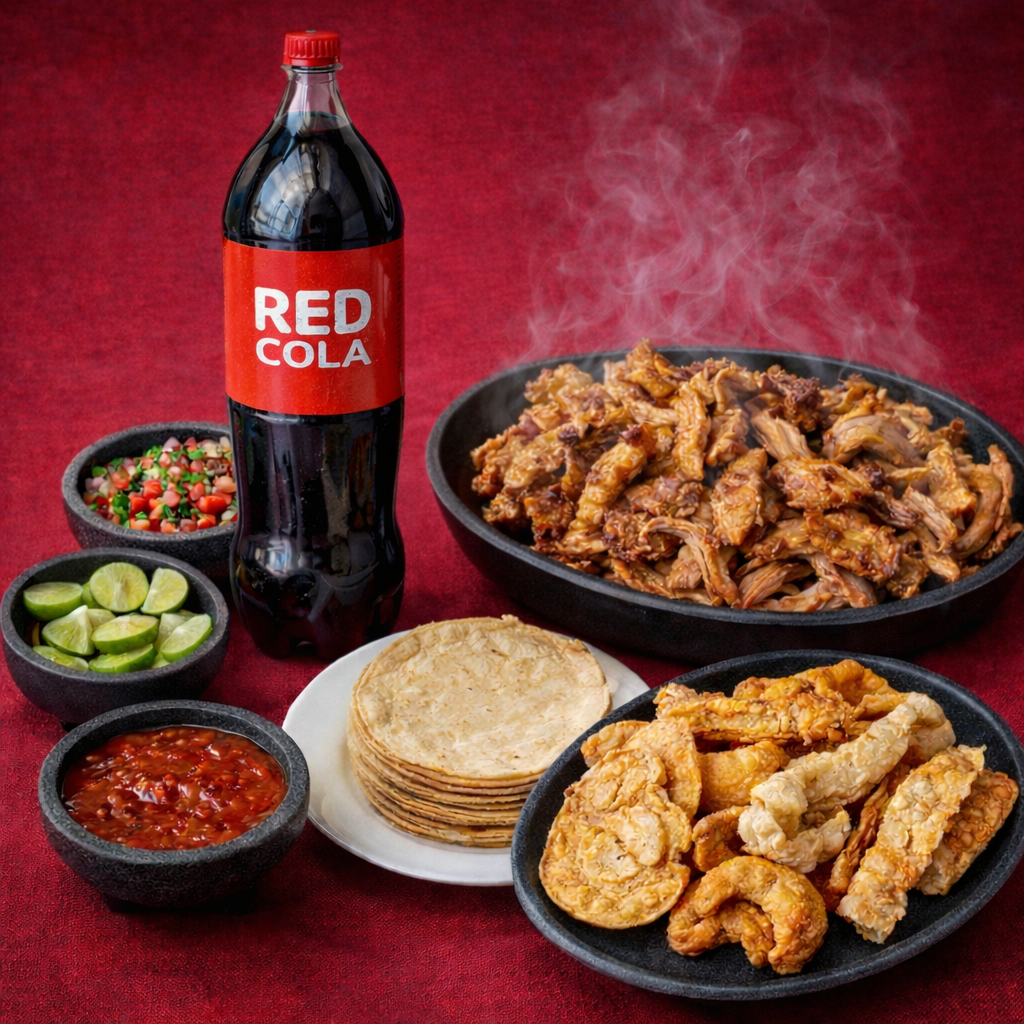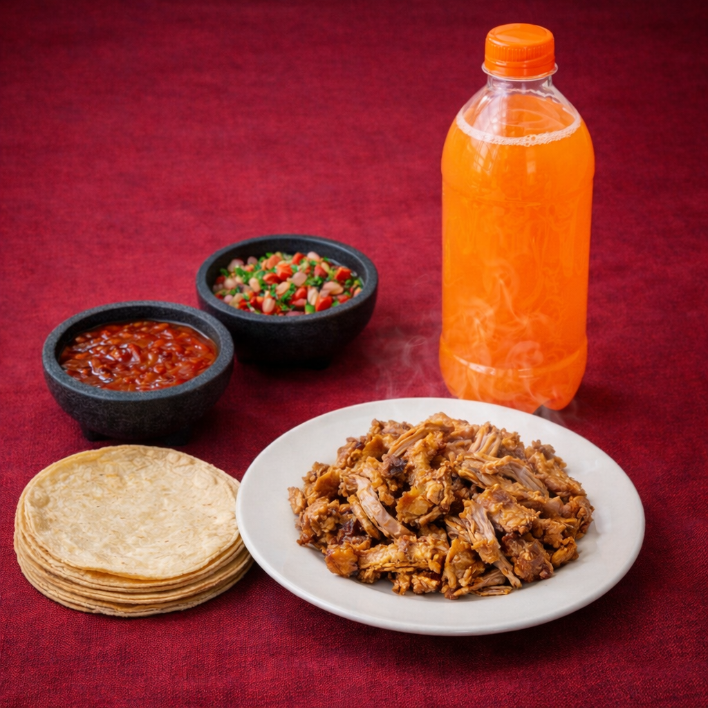 1/2 Kg de Carnitas, 1/2 Kg de Tortillas, 100 gr de Chicharrón, 1 Refresco de 2 litros, Salsa, Chiles en vinagre, Limones, Pico de gallo,