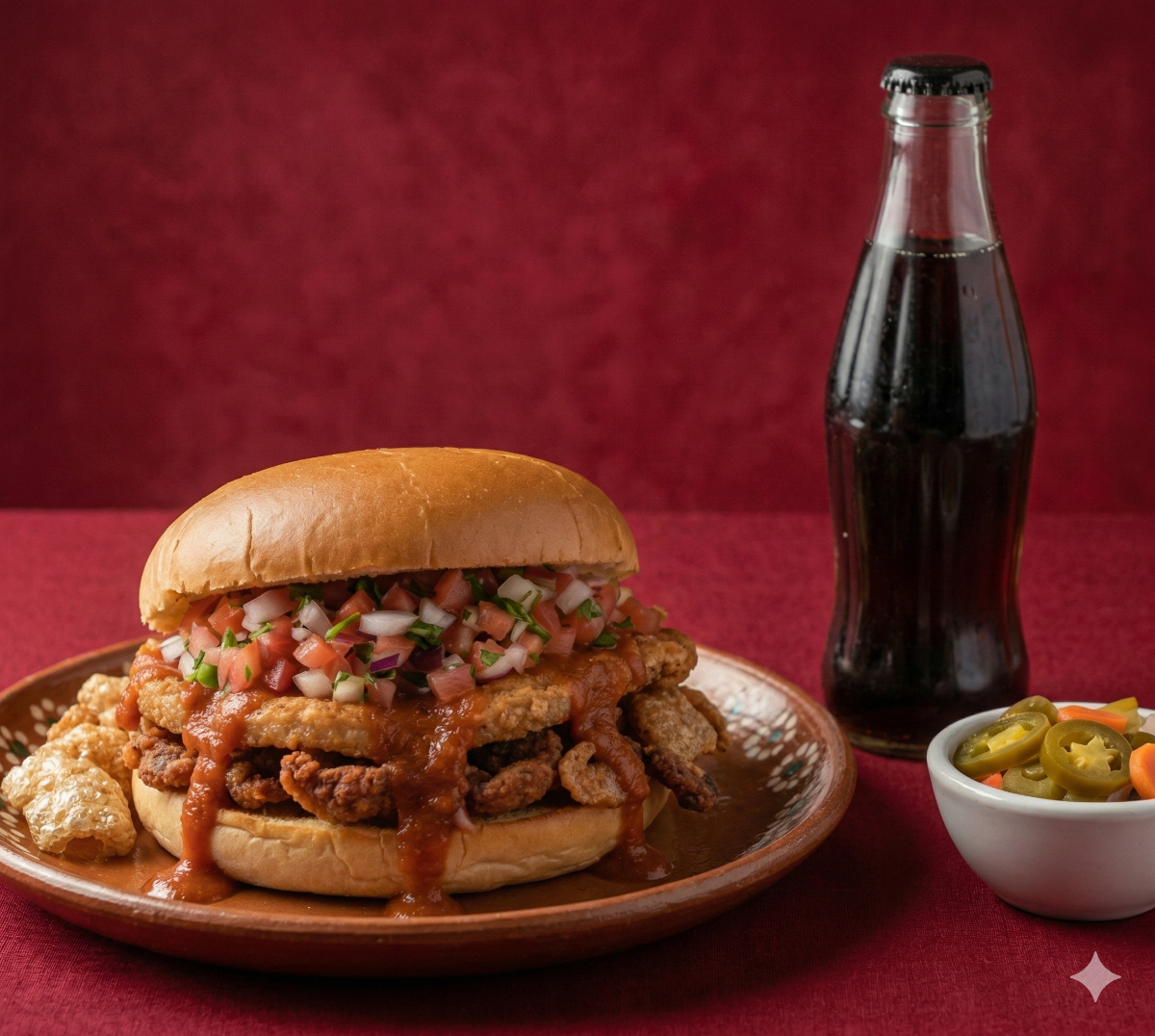 1 Torta de Chicharrón con cueritos, 1 Refresco de 600 ml, Pico de Gallo, Salsa Roja, Chiles en vinagre