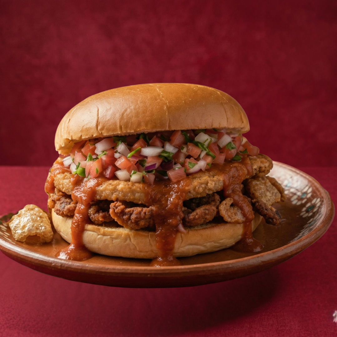 1 Torta de Chicharrón con cueritos, Pico de Gallo, Salsa Roja, Chiles en vinagre