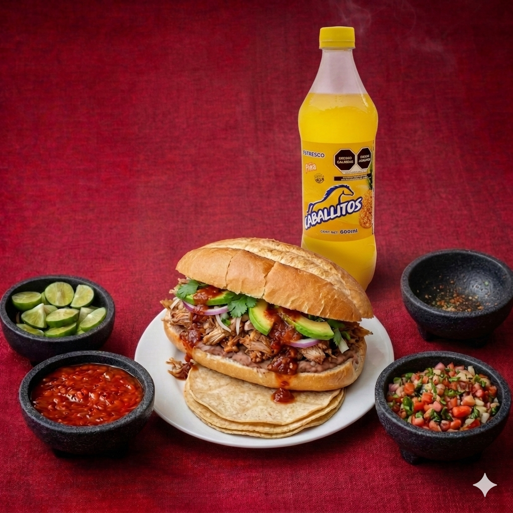 1 Torta de Carnitas, 1 Refresco de 600 ml, Pico de Gallo, Salsa Roja, Chiles en vinagre