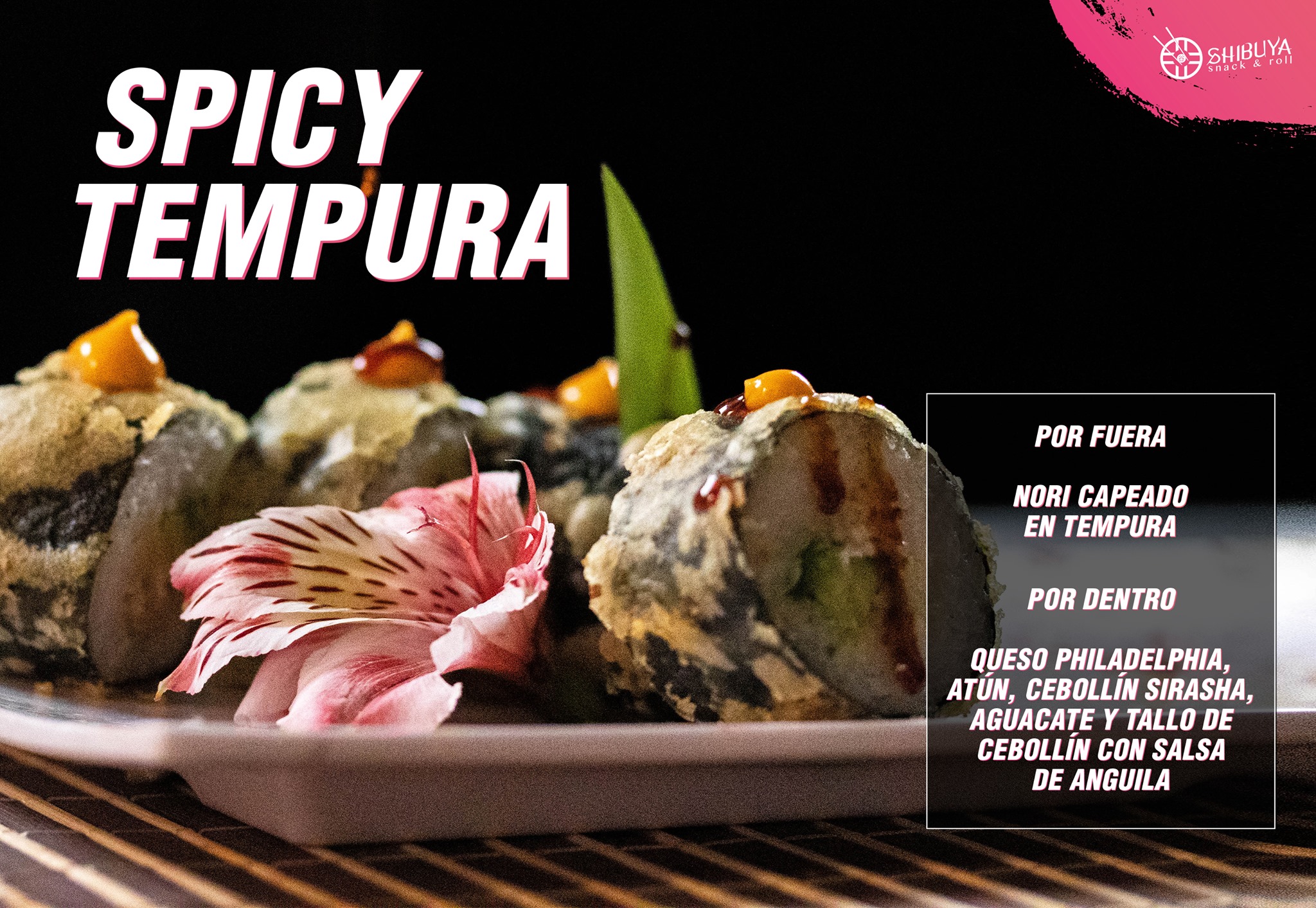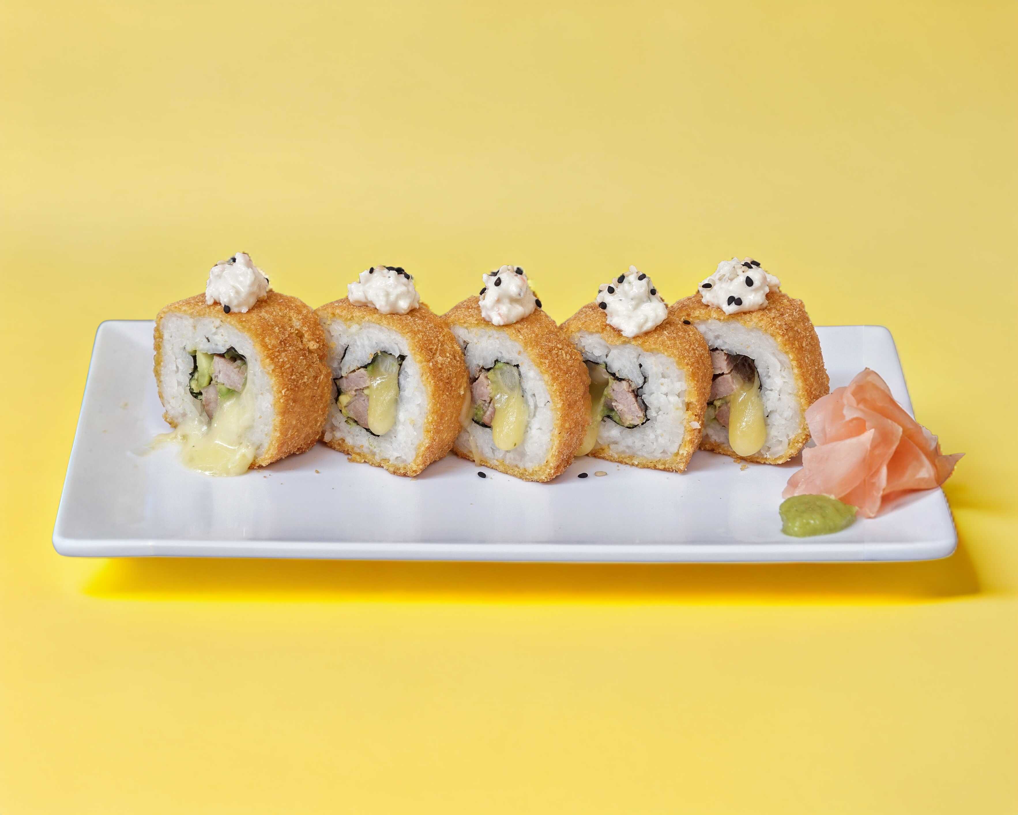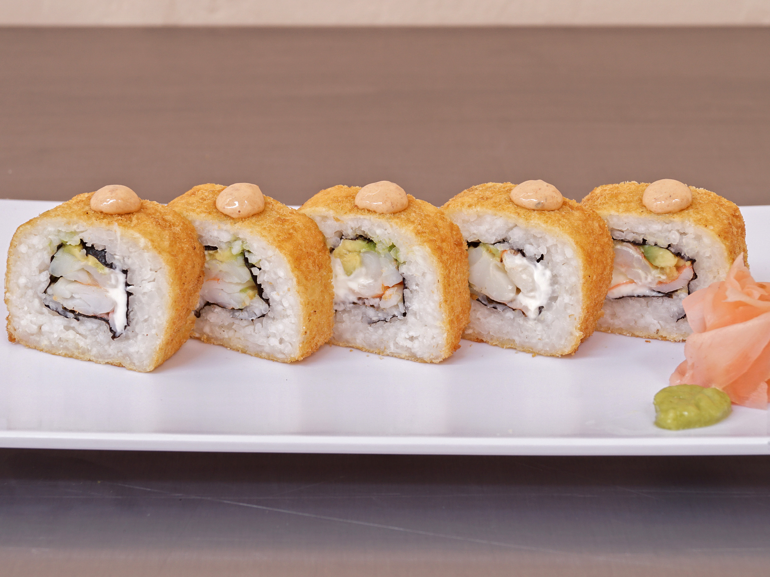 Por fuera: nori capeado en tempura. Por dentro: queso philadelphia, atún, cebollín, sirasha, aguacate, salsa de soya y salsa de anguila.
