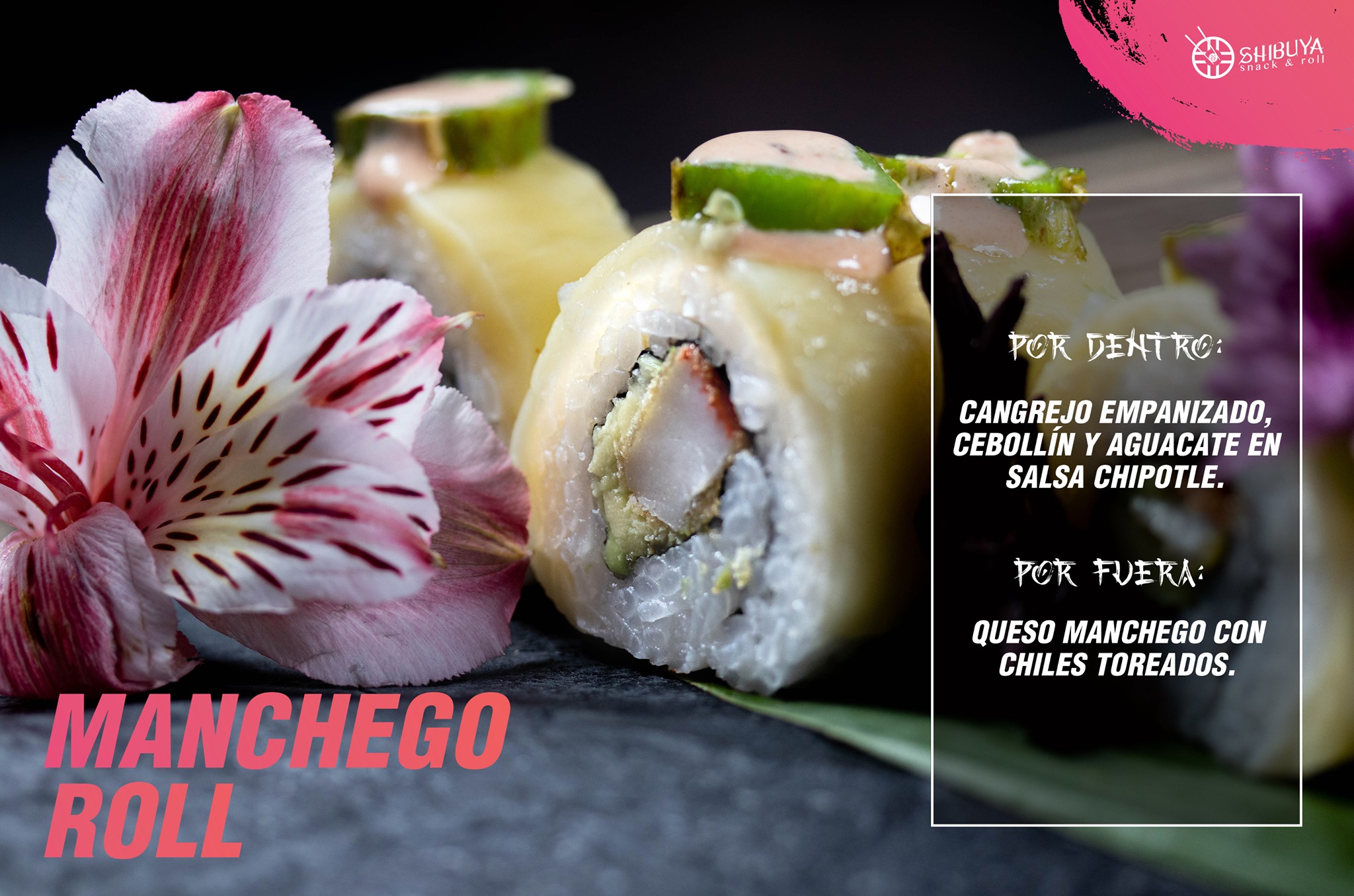Por dentro: cangrejo empanizado, cebollín y aguacate en salsa chipotle. Por fuera: queso manchego con chiles toreados y salsa de soya.