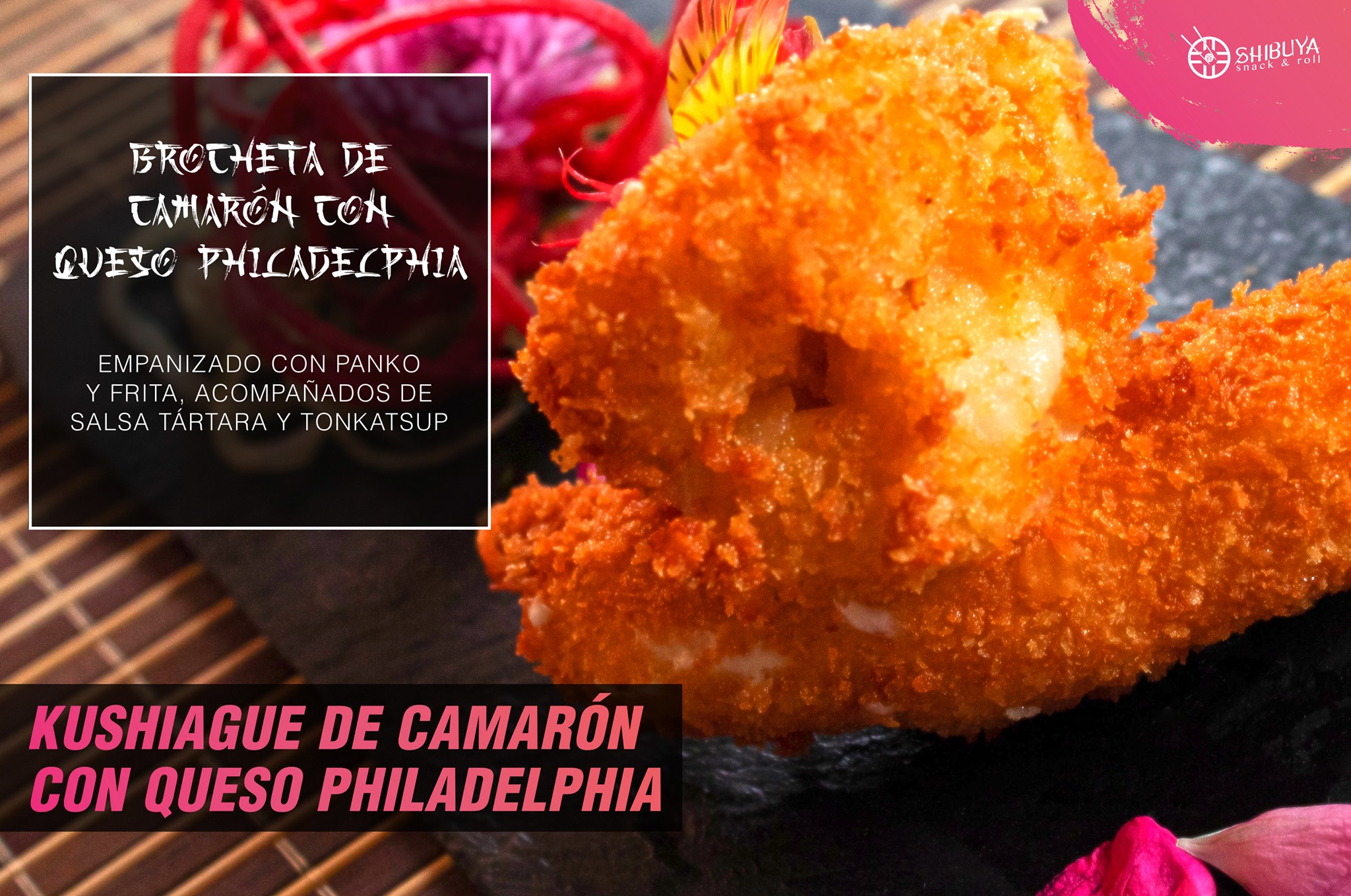 2 Piezas. Brochetas de camarón con queso philadelphia, empanizado con panko y frita, acompañados de salsa tártara y tonkatsup.