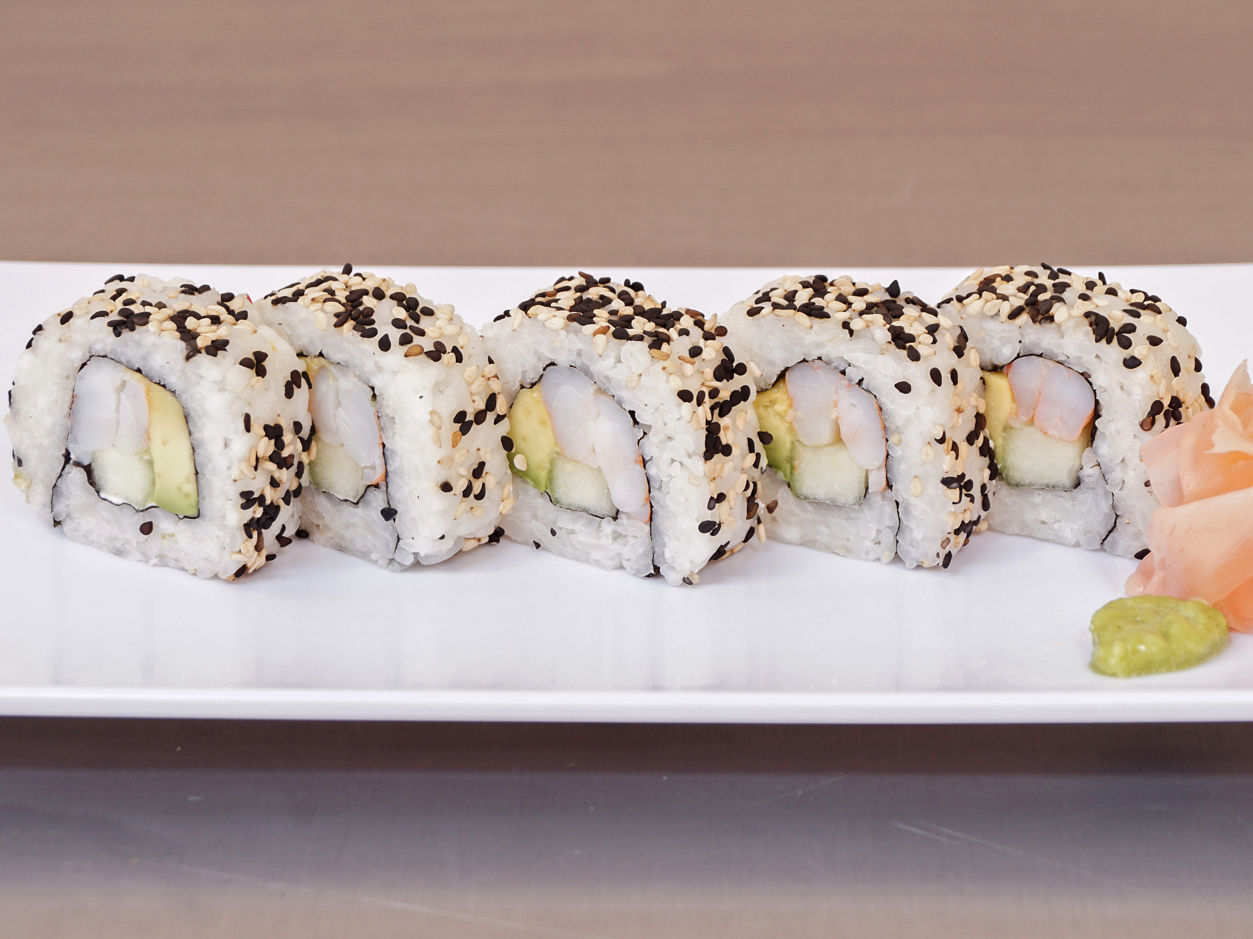 Por fuera: arroz y ajonjolí mixto. Por dentro: nori, pepino, aguacate, camarón y salsa de soya.