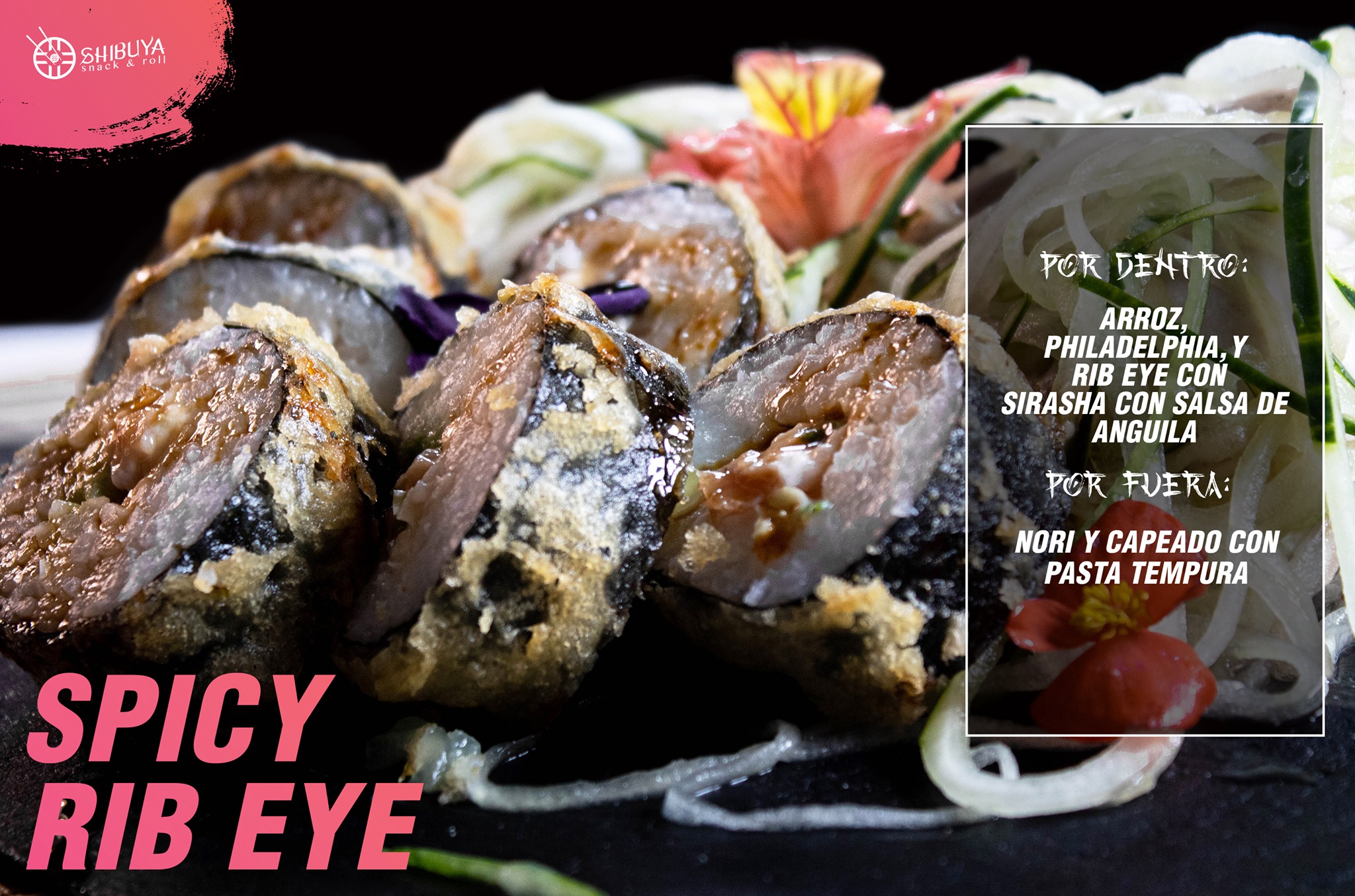 Por fuera: nori y capeado con pasta tempura. Por dentro: arroz, queso philadelphia, rib eye, cebollín con sirasha y salsa de anguila.