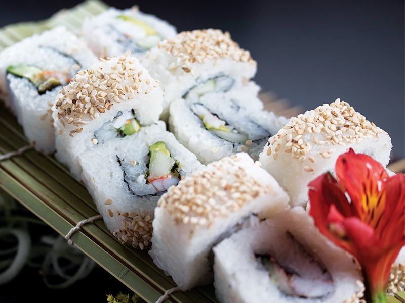 Por fuera arroz y ajonjolís y por dentro pepino, aguacate y surimi.