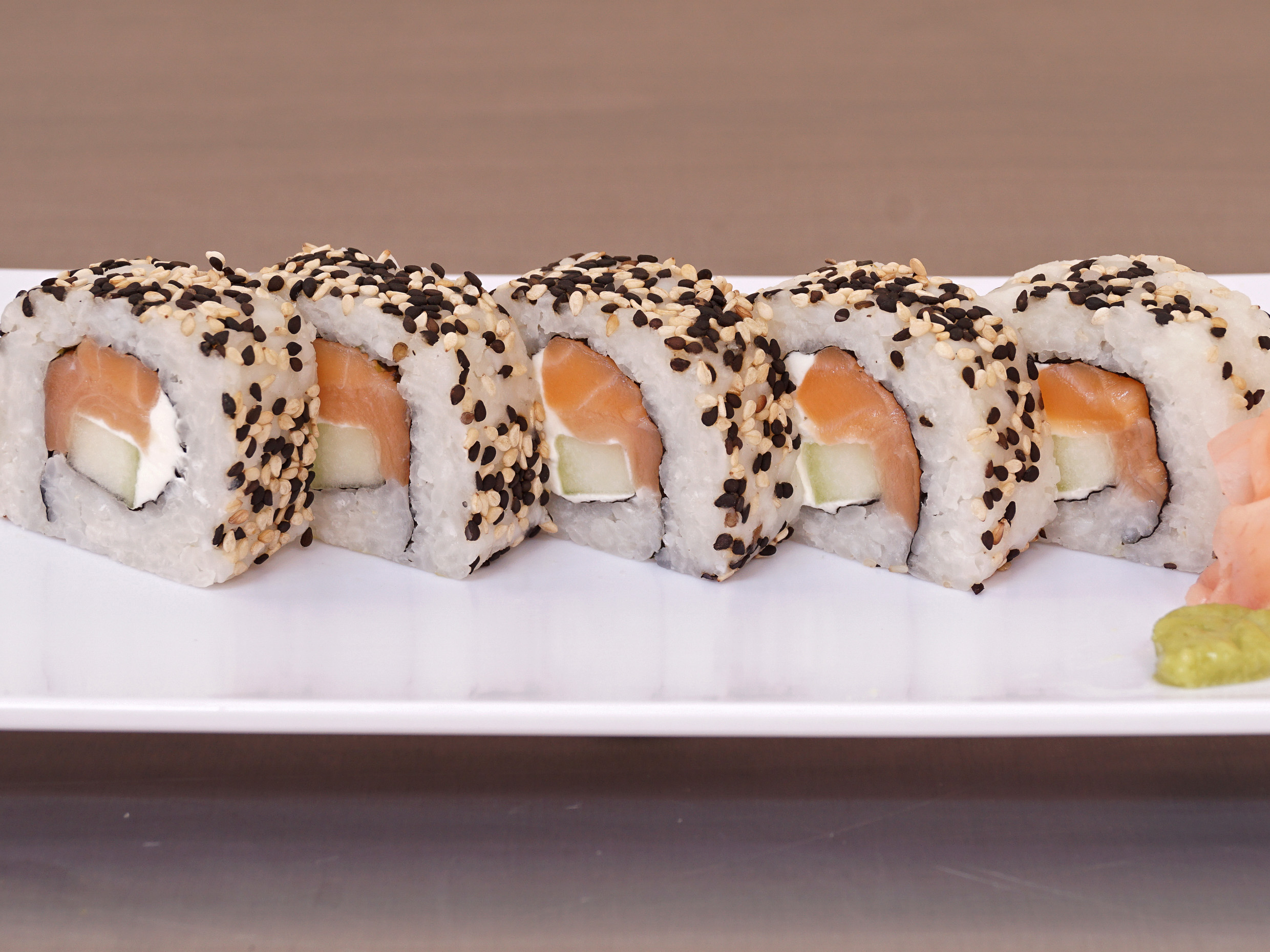 Por fuera: arroz y ajonjolí mixto. Por dentro: salmón, queso philadelphia, pepino y nori, acompañado de salsa de soya.