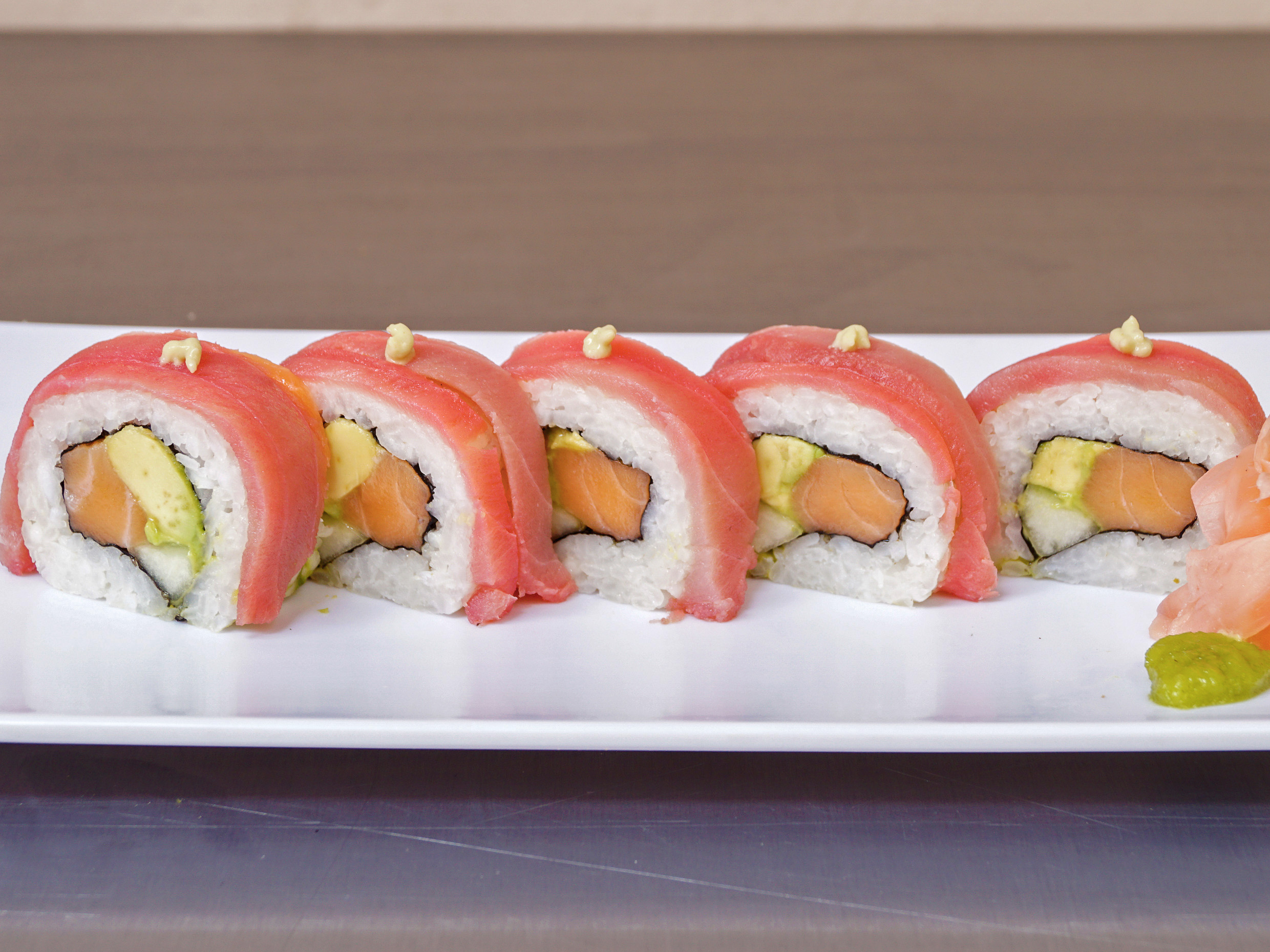 Por dentro: pepino aguacate y salmón. Por fuera: finas láminas de atún fresco con arroz y salsa de soya.