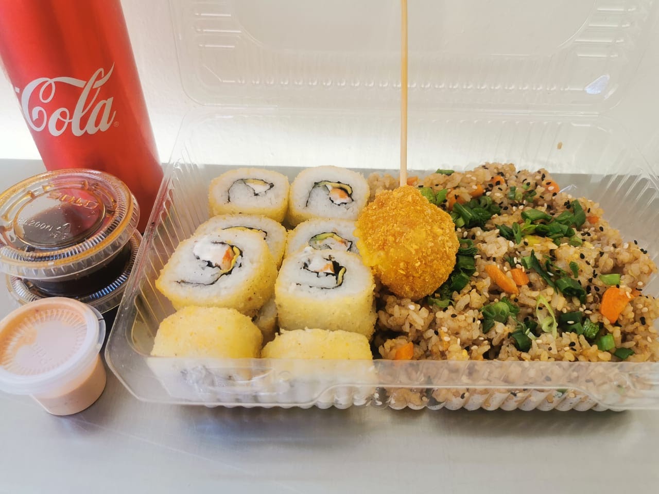 Sushi (panco camarón, arrachera roll, philadelphia roll o california roll), yakimeshi de verduras y kushiague de queso.