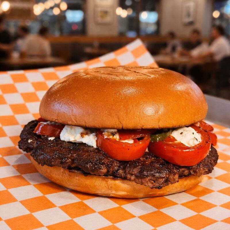 Smash 100 g, queso de cabra, pimientos salteados, pan brioche.